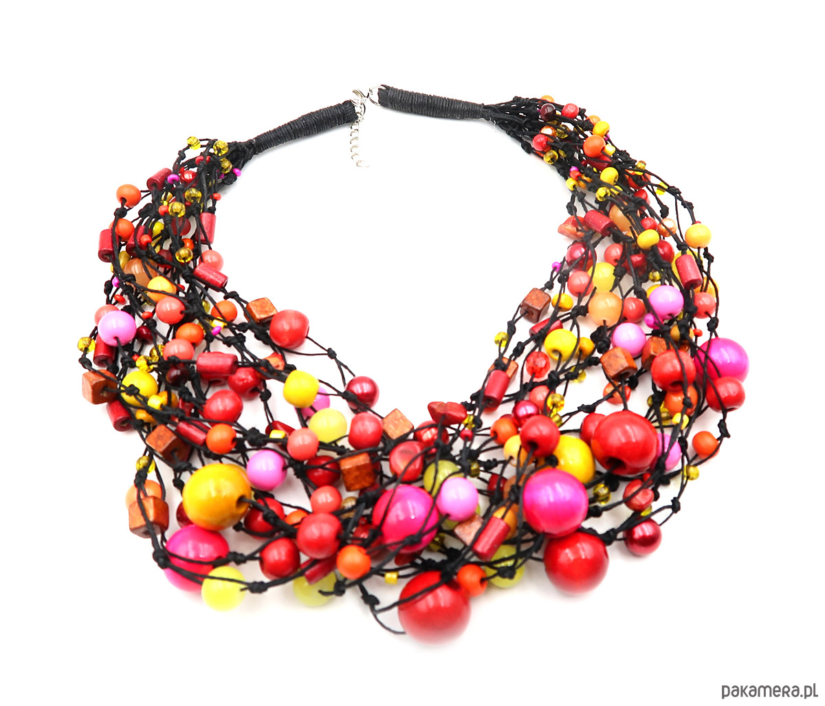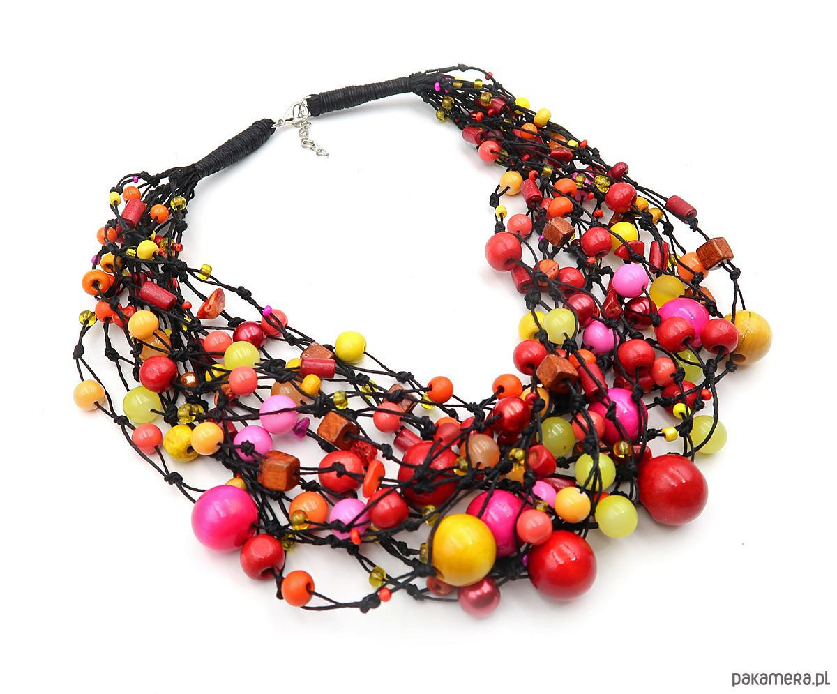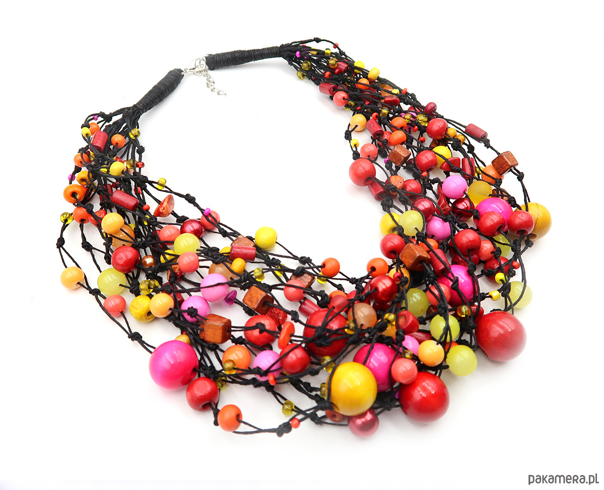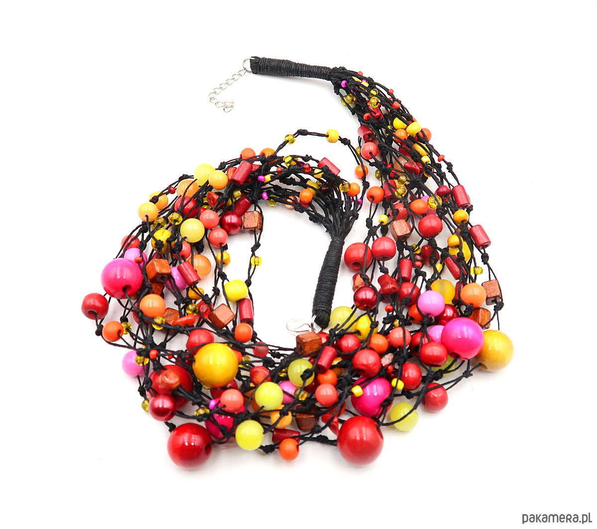 W strukturze naszyjnika znajdują się starannie dobrane elementy: drewniane akcenty, szklane korale czeskiej firmy Jablonex, bryłki koralowca oraz subtelne szklane perełki, które dodają całości światła i głębi.