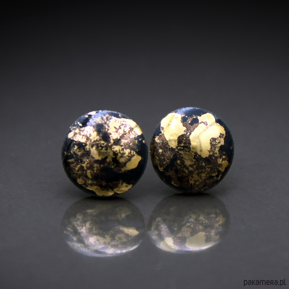 Ceramiczne okrągłe kolczyki, ręcznie wykonane z delikatnej gliny kamionkowej, jednostronnie szkliwione czarnym błyszczącym szkliwem, dekorowane złotem naszkliwnym, na antyalergicznych sztyftach w kolorze srebrnym. Średnica ok. 16mm. Polecam
