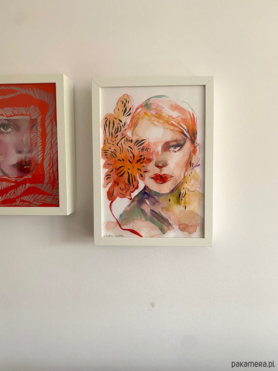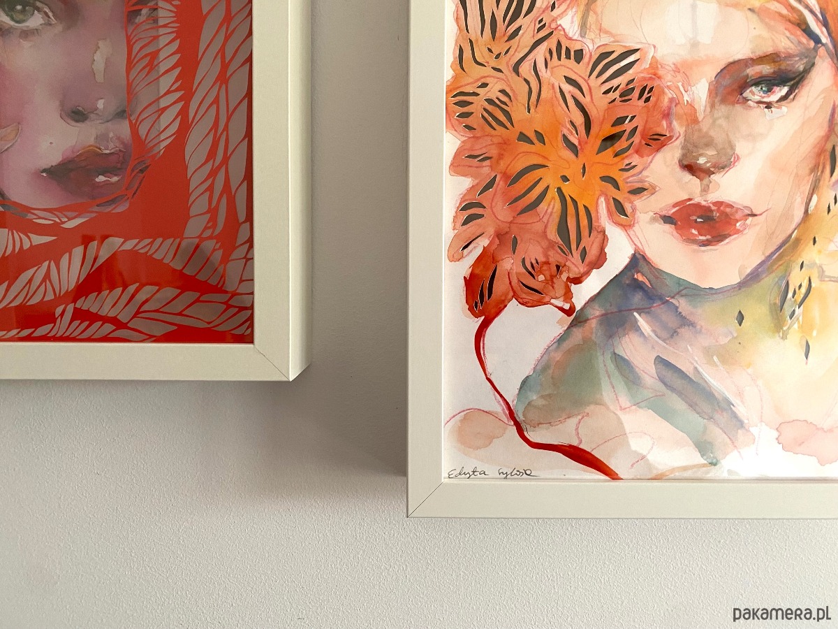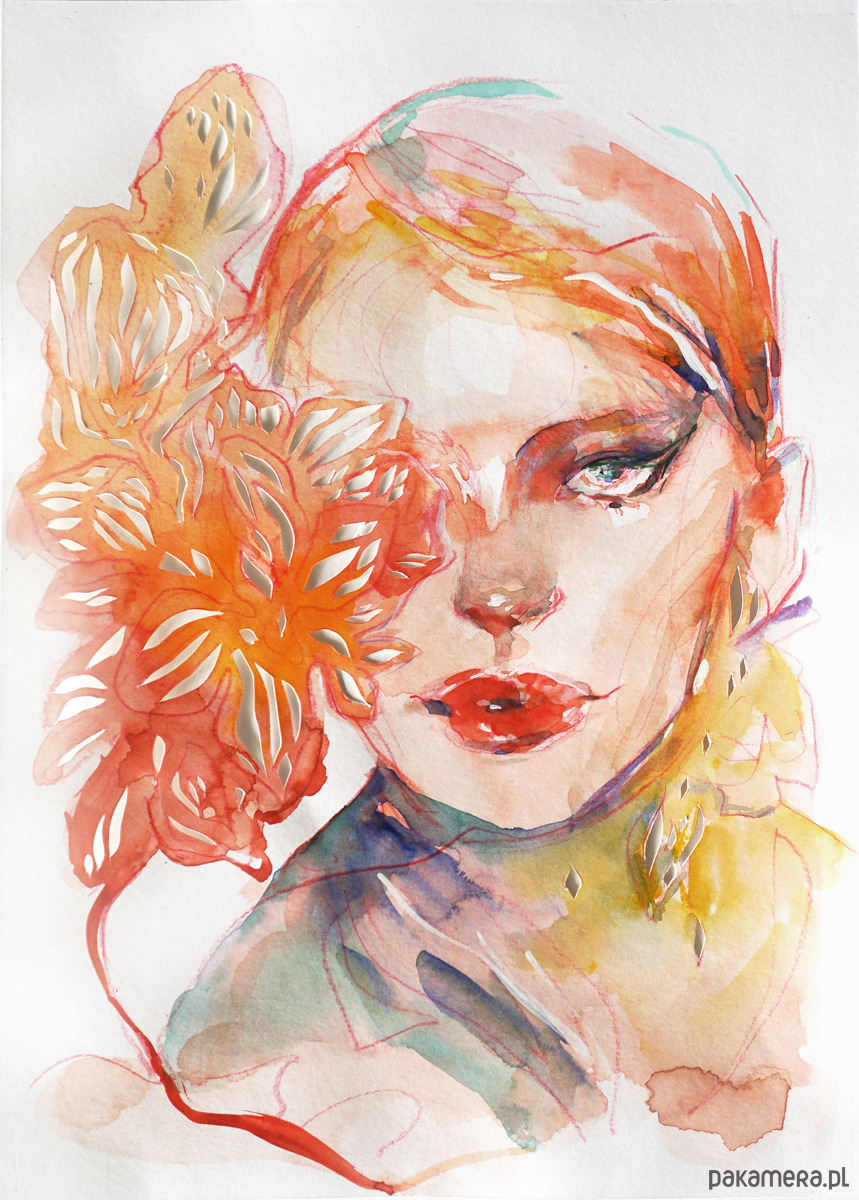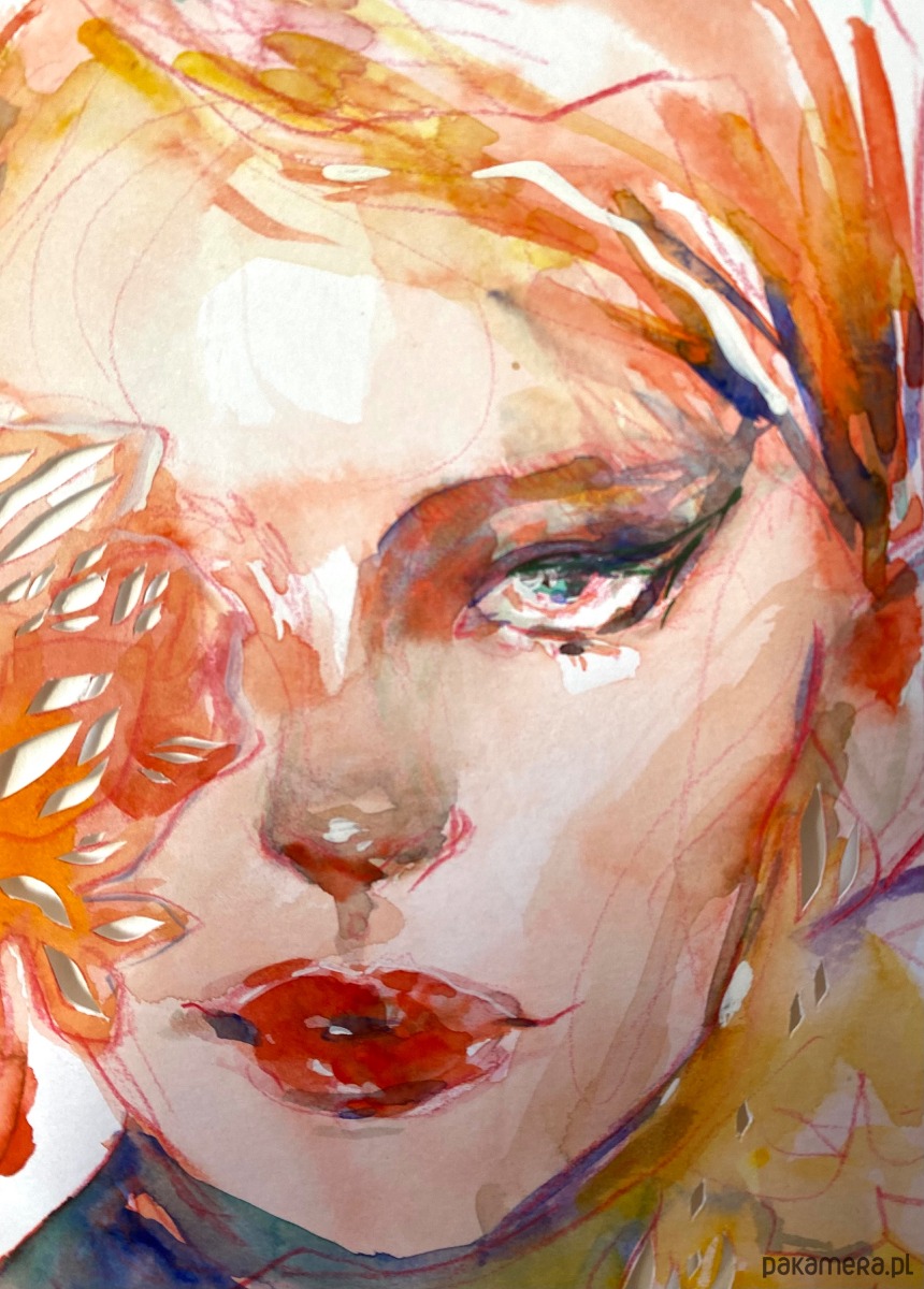 Ta praca powstała z połączenia dwóch technik: intensywnej, nasyconej kolorami akwareli oraz misternie wycinanej ręcznie wycinanki. Najpierw powstał portret malowany farbami, a następnie został wzbogacony o ażurową strukturę wyciętą skalpelem z papieru.