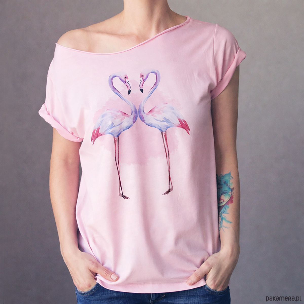 Różowa flamingi na różowej koszulce oversize z ciętym dekoltem.