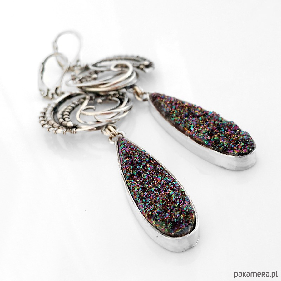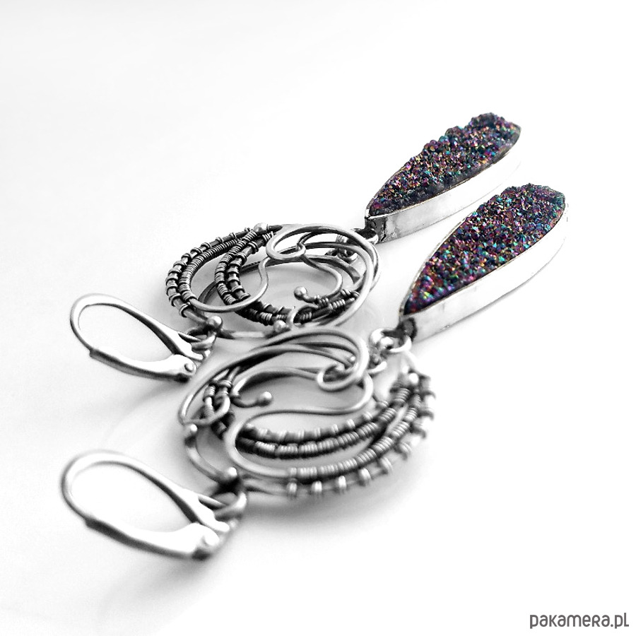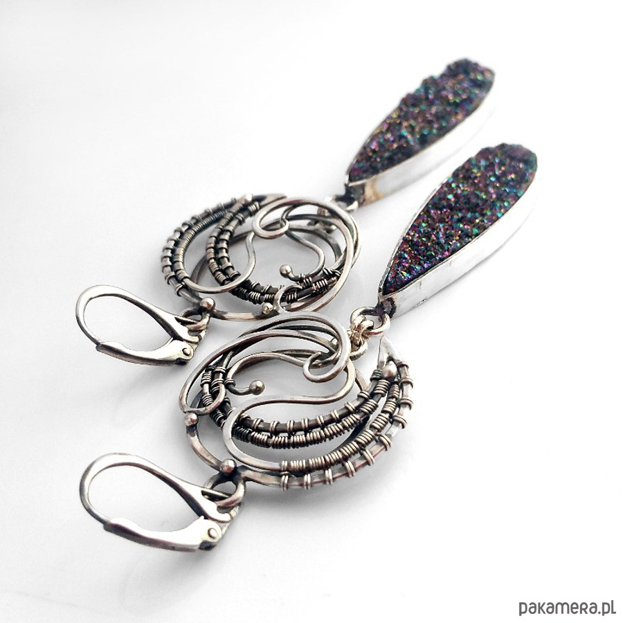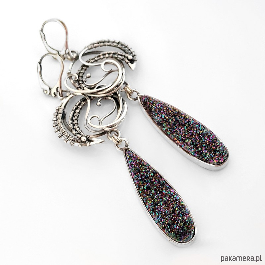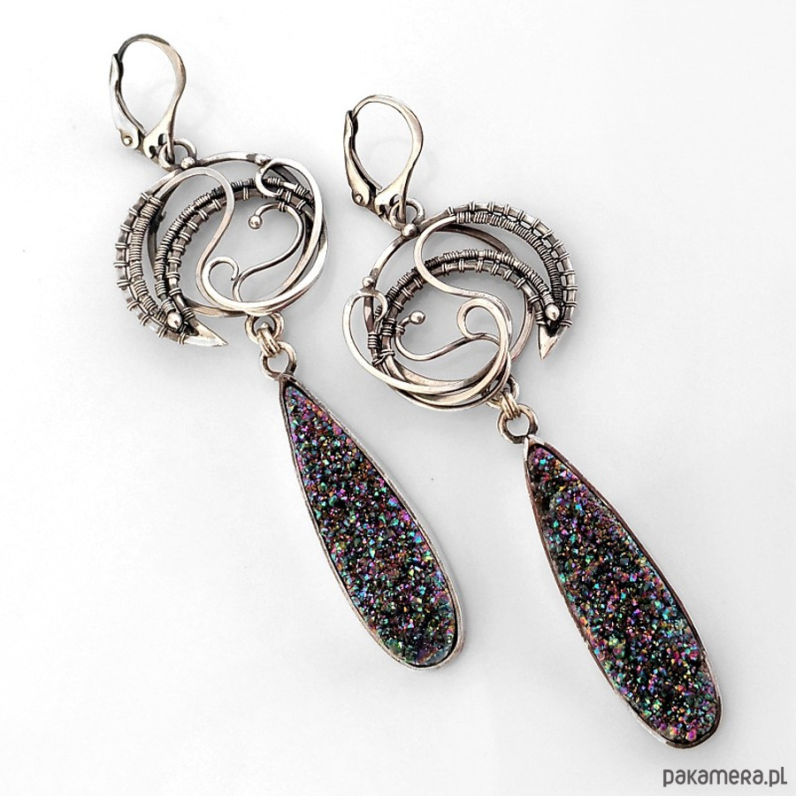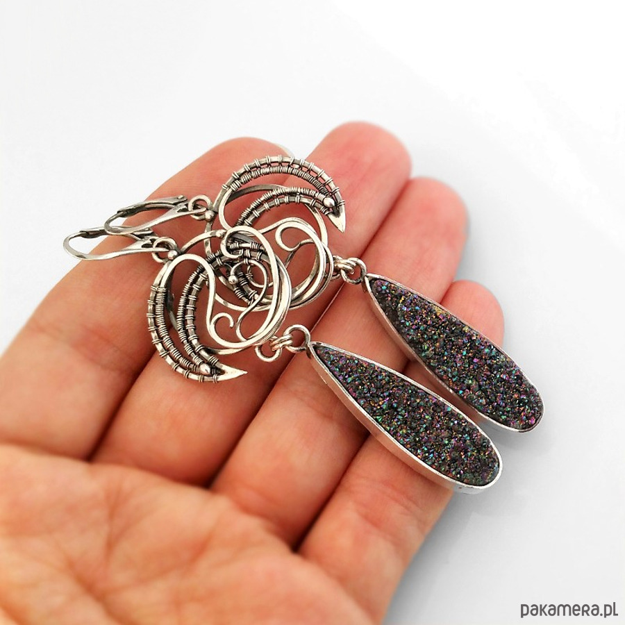 Wyjątkowe, długie kolczyki wykonane w całości ręcznie, wyplatane w pracochłonnej technice wire wrapping ze srebra próby 930 i 999, ozdobione kroplami kwarcu tytanowego. Kolczyki zostały zawieszone na srebrnych zamkniętych biglach. Wymiary wyplatanej części kolczyka w najszerszym miejscu: ok. 26x26mm, długość całego kolczyka z biglem i kroplą ok. 80mm, długość kropli druzy tytanowej ok 40mm. Całość została mocno oksydowana i wypolerowana. Biżuteria zostanie ozdobnie zapakowana.