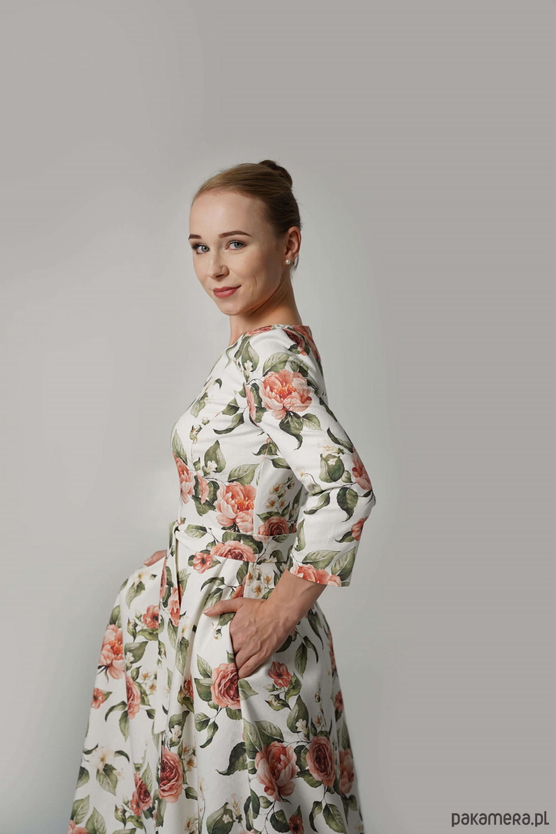 Florentyna to sukienka o prostym, ponadczasowym kroju, uszyta z bawełnianej tkaniny, o gorsetowej górze i eleganckim dekolcie w łódkę. Spódnicę uszyliśmy z połowy koła.