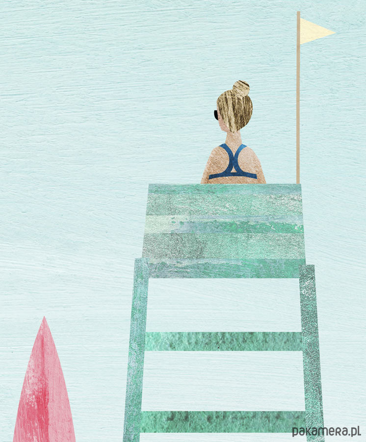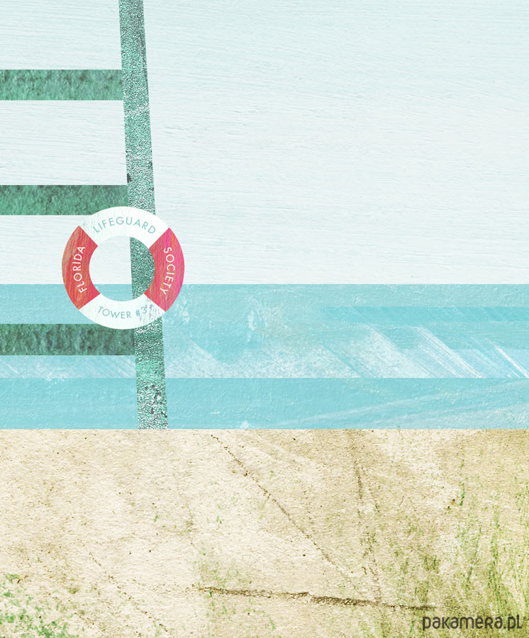 Plakat podróżniczy w stylu vintage zachęcający do odwiedzenia Florydy w USA. W centralnym punkcie grafiki znajduje się turkusowa wieża ratownicza. Samotna ratowniczka czuwa nad bezludną plażą wpatrując się w łagodne fale. Obok w piasek wbita jest deska surfingowa. Scenę otacza długa trawa porastająca dzikie wydmy. Grafika inspirowana plakatami podróżniczymi i folderami z lat 20-tych XX wieku.