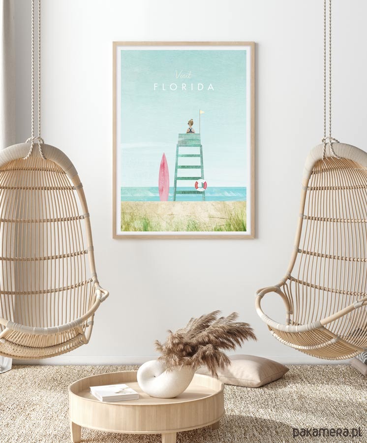 Plakat podróżniczy w stylu vintage zachęcający do odwiedzenia Florydy w USA. W centralnym punkcie grafiki znajduje się turkusowa wieża ratownicza. Samotna ratowniczka czuwa nad bezludną plażą wpatrując się w łagodne fale. Obok w piasek wbita jest deska surfingowa. Scenę otacza długa trawa porastająca dzikie wydmy. Grafika inspirowana plakatami podróżniczymi i folderami z lat 20-tych XX wieku.