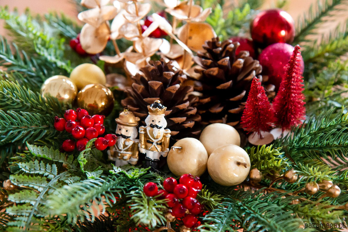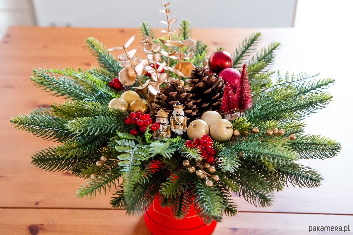 Flower box w kolorze czerwonym ze świetnej jakości sztucznych gałązek oraz czerwonych bombek, owoców głogu, szyszek i złotych dodatków. Jest to dekoracja, którą można wykorzystać przez co najmniej kilka lat. Świetnie będzie prezentować się na komodzie lub na świątecznym stole. Średnica boxa to ok 11 cm, szerokość całej ozdoby to ok 47 cm a wysokość to ok 33 cm.