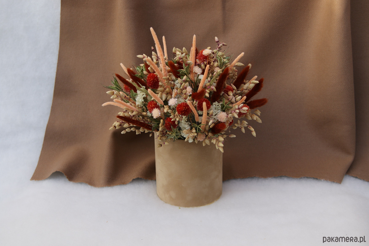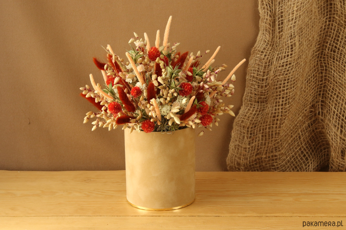 Flower box z suszonych kwiatów i roślin to naturalna dekoracja do domu lub biura. Bardzo uniwersalna, pełna ciepła klasyczna kompozycja.