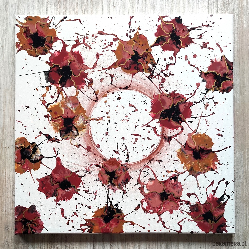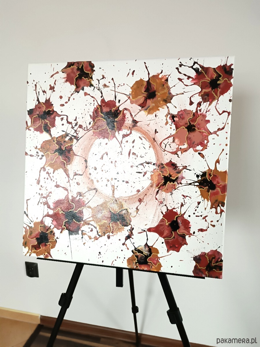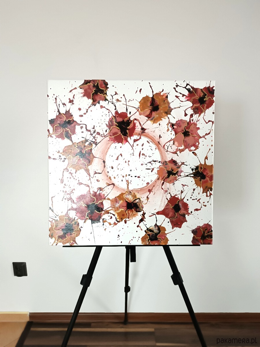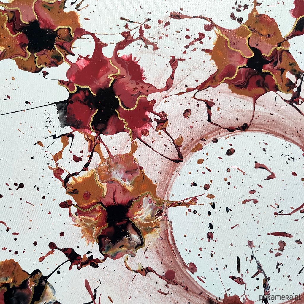 Flower Flow IV - wariacja na temat kwiatów, obraz abstrakcyjny malowany farbami akrylowymi na dobrej jakości podobraziu bawełnianym produkcji polskiej. W skład palety barw wchodzą farby metaliczne, które pięknie odbijają światło. Zastosowałam tutaj technikę mieszaną - pouring na suchym tle. Całość jest zabezpieczona werniksem z wysokim połyskiem. Obraz jest gotowy do powieszenia bez ramy, boki są przedłużeniem obrazu. Sygnowany z boku podobrazia, więc można go powiesić na 4 różne sposoby, w zależności od upodobania.