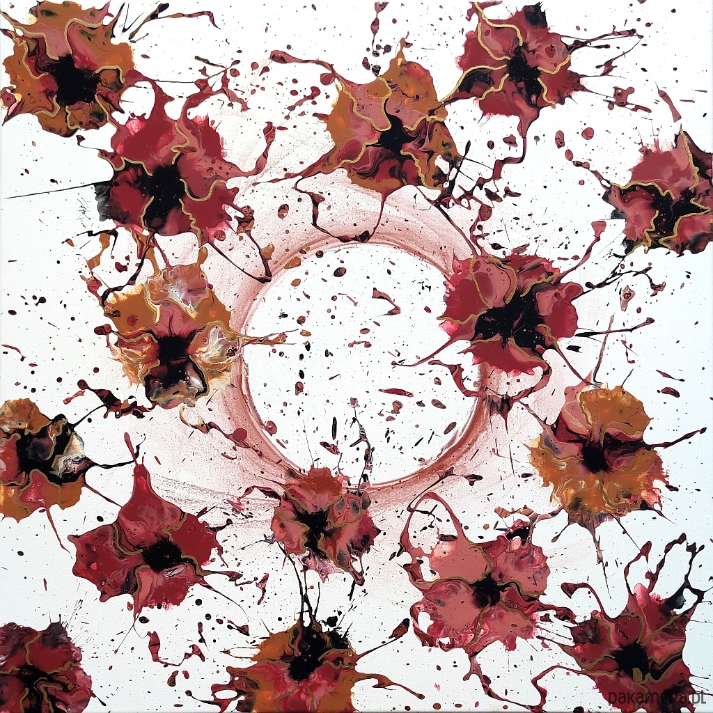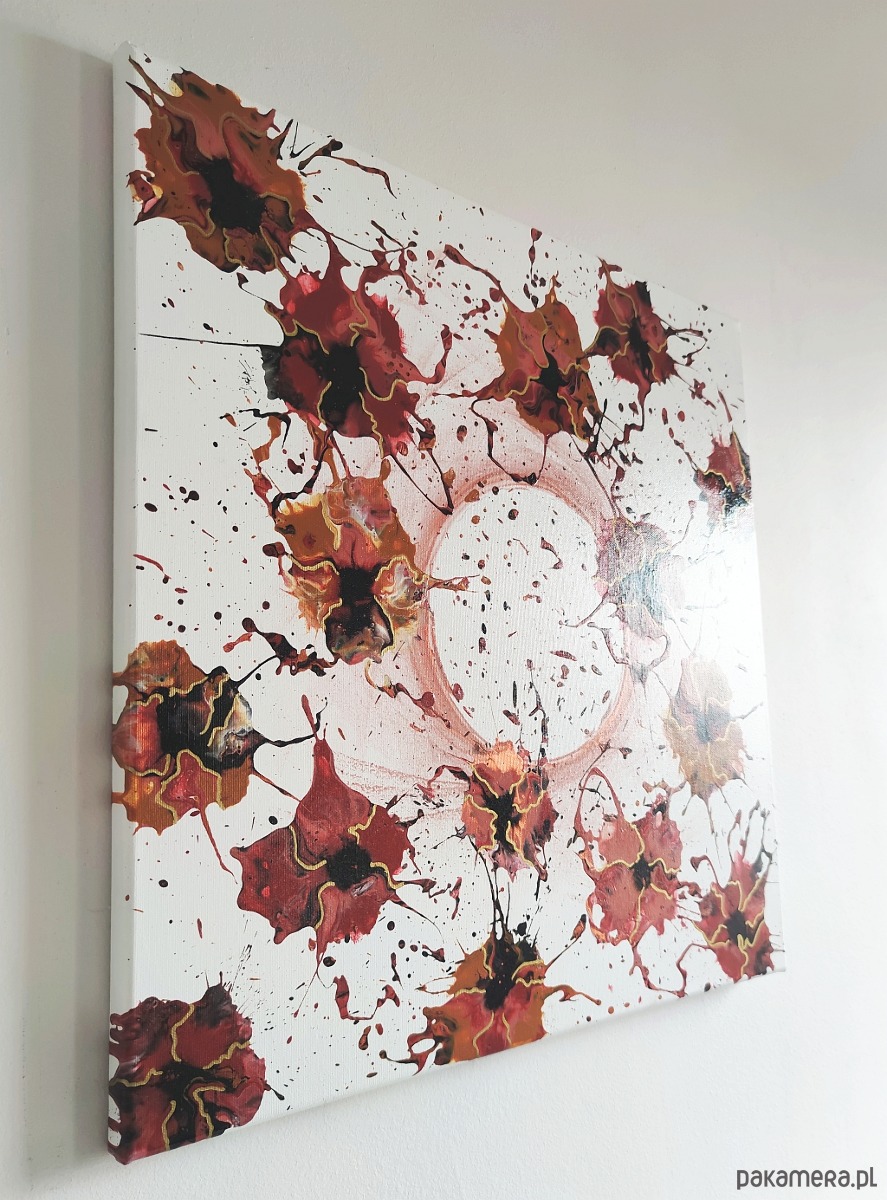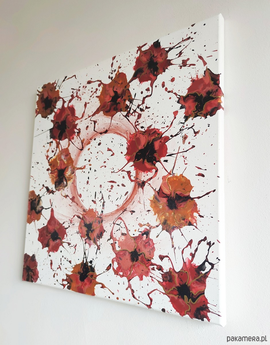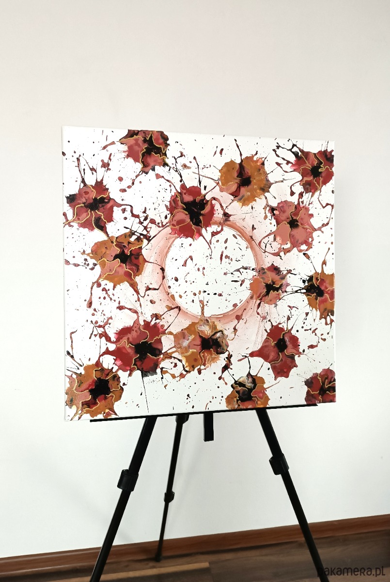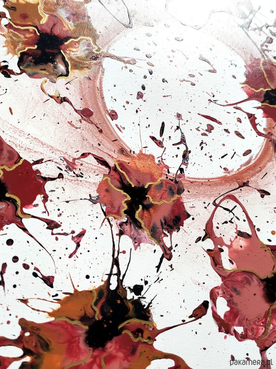 Flower Flow IV - wariacja na temat kwiatów, obraz abstrakcyjny malowany farbami akrylowymi na dobrej jakości podobraziu bawełnianym produkcji polskiej. W skład palety barw wchodzą farby metaliczne, które pięknie odbijają światło. Zastosowałam tutaj technikę mieszaną - pouring na suchym tle. Całość jest zabezpieczona werniksem z wysokim połyskiem. Obraz jest gotowy do powieszenia bez ramy, boki są przedłużeniem obrazu. Sygnowany z boku podobrazia, więc można go powiesić na 4 różne sposoby, w zależności od upodobania.