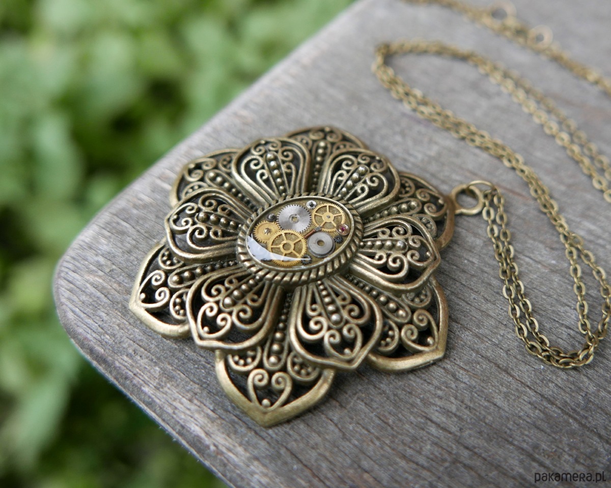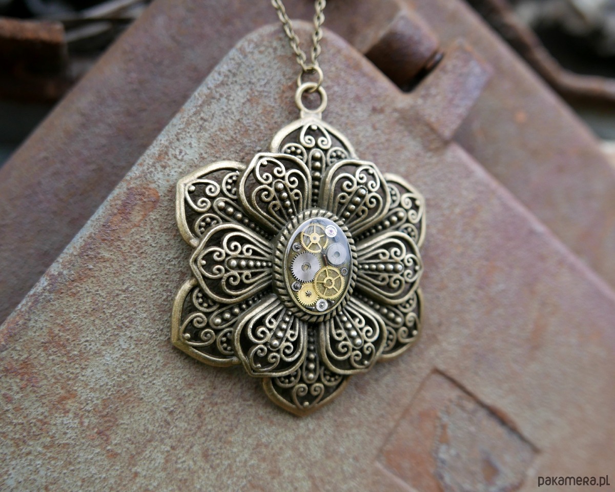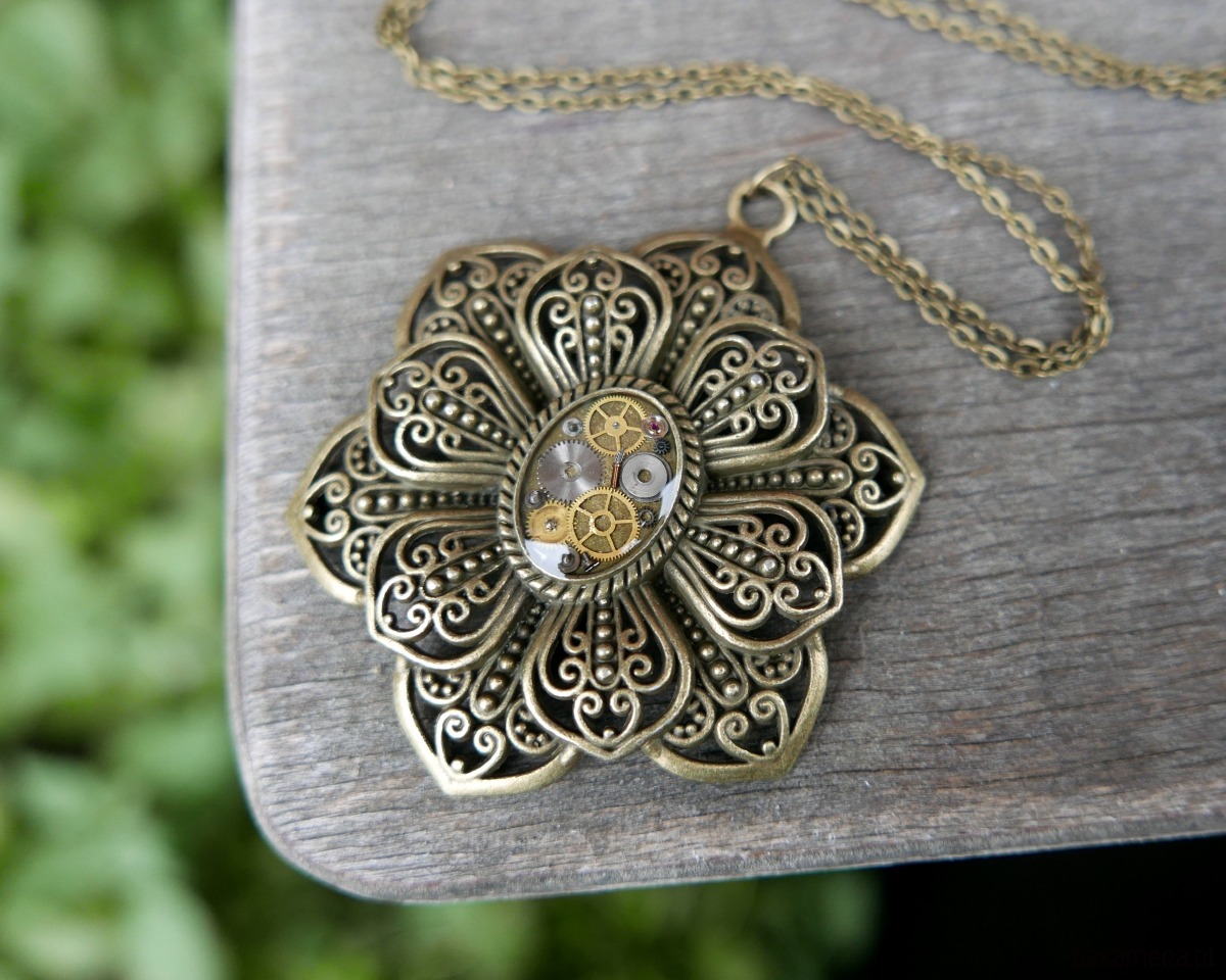 Okazały, mosiężny naszyjnik w stylu steampunk. W owalnej zawieszce zamknięto kompozycję z oryginalnych części mechanizmu zegarka i żywicy epoksydowej.