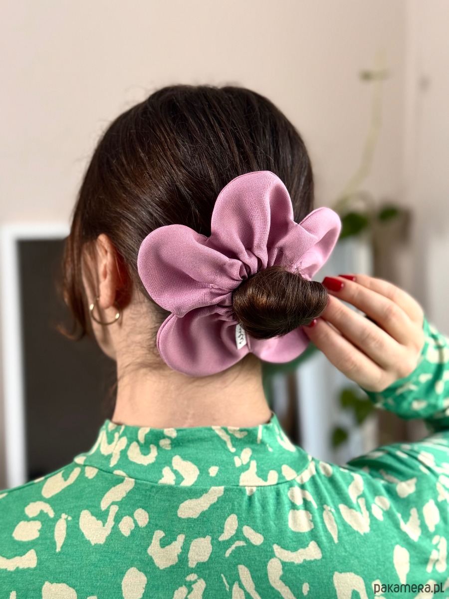 Scrunchie w kształcie kwiatuszka, wykonana z tkaniny w kolorze różowym. To subtelna, a zarazem wyrazista ozdoba do włosów. Jej delikatna, kwiatowa forma dodaje uroku każdej fryzurze, doskonale komponując się zarówno z codziennymi, jak i eleganckimi stylizacjami.