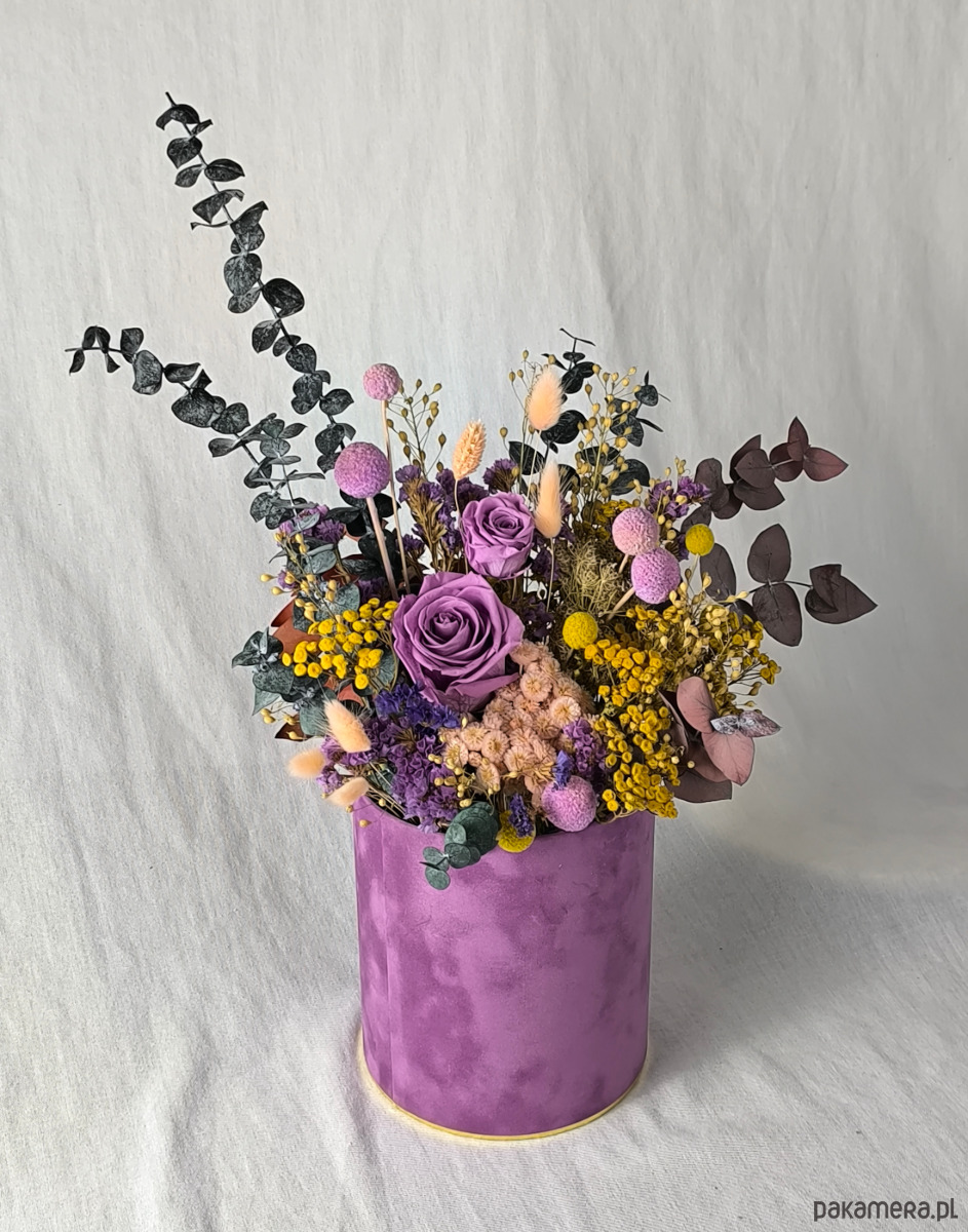 ,,Fiolet box" welurowy flower box z fioletowymi wiecznymi różami