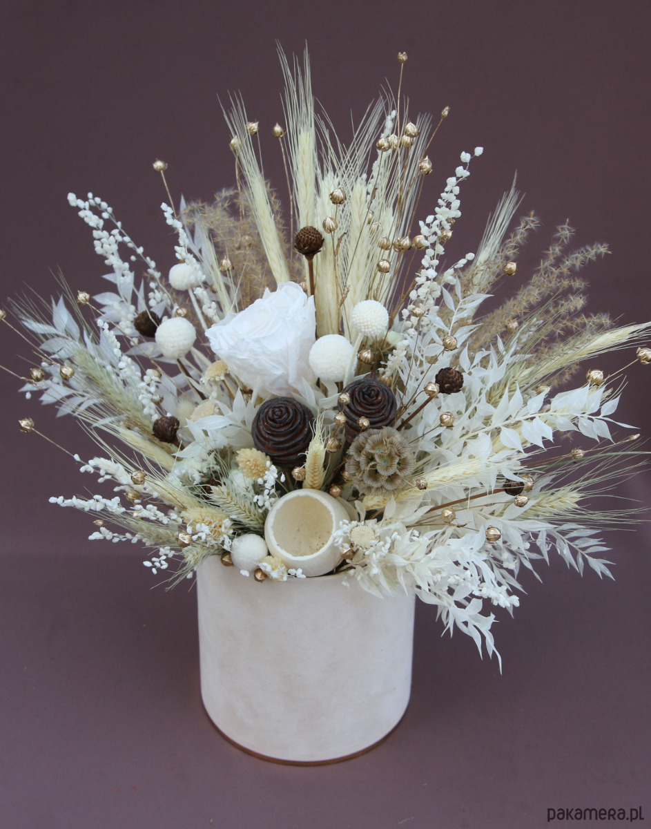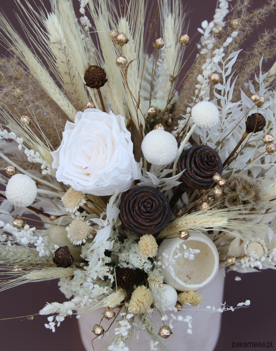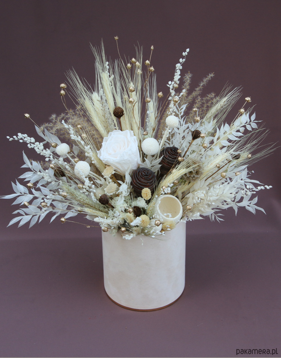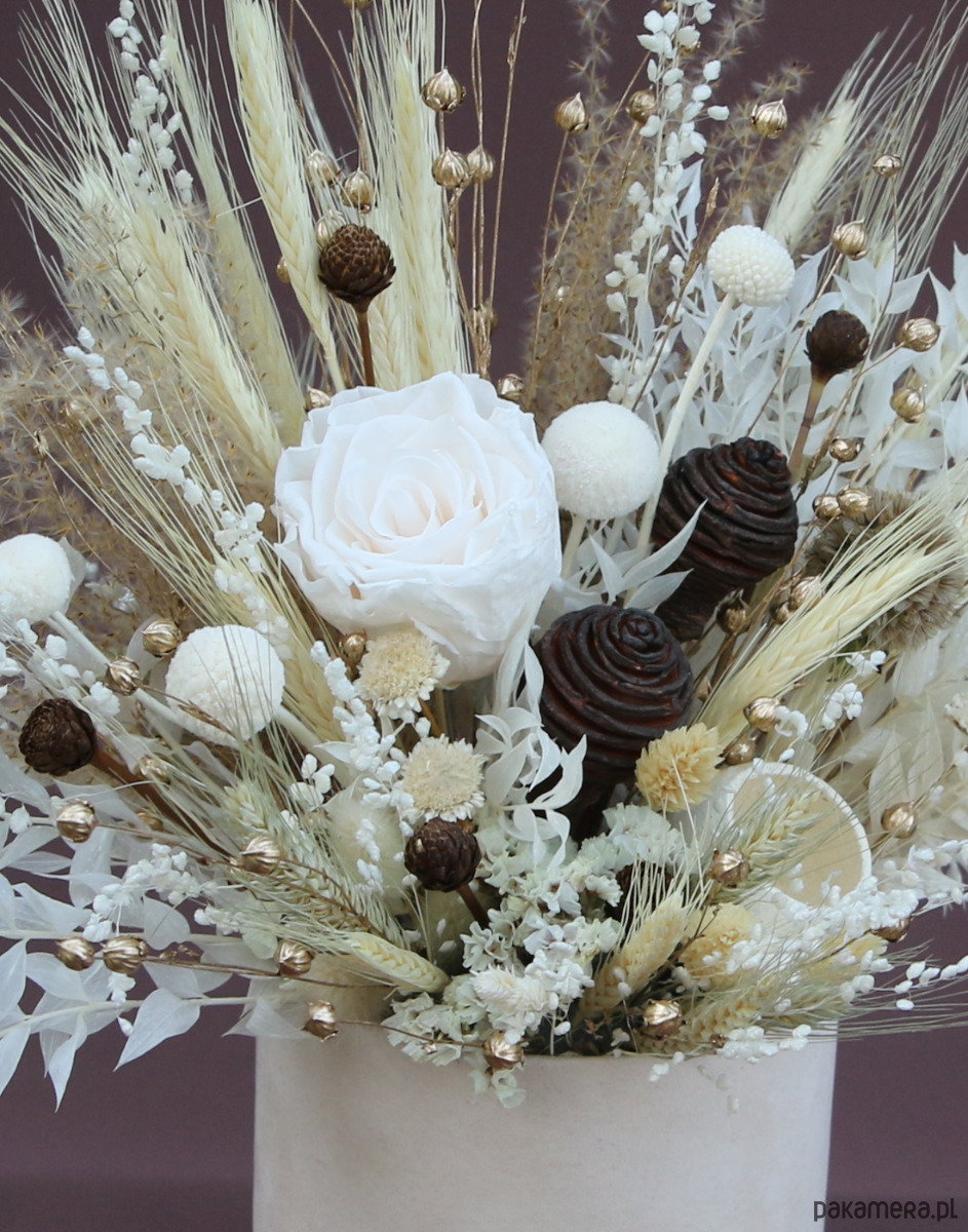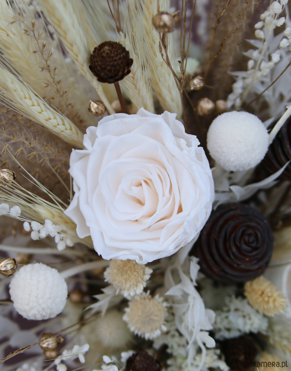 Wyjątkowy flowerbox z dominacją jasnych odcieni kremowych i białych, z dodatkiem brązu, stworzony z myślą o miłośnikach ponadczasowej elegancji. W centrum kompozycji znajduje się piękna migdałowa stabilizowana róża, zachowująca swój naturalny wygląd nawet przez kilka lat- bez podlewania i pielęgnacji