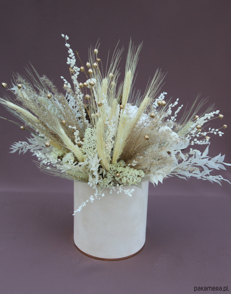 Całość umieszczona w kremowym welurowym boxie, który dodaje kompozycji miękkości i luksusowego charakteru. Podkreśla ekskluzywny charakter kwiatów. Kolorystyka sprawia, że flower box jest lekki, harmonijny i doskonale wpisuje się w jasne, nowoczesne wnętrza. Egzotyczne elementy dodają całości uroku i intrygują, a dodatek złoconego lnu świetnie korespondują ze złotym wykończeniem boxu.