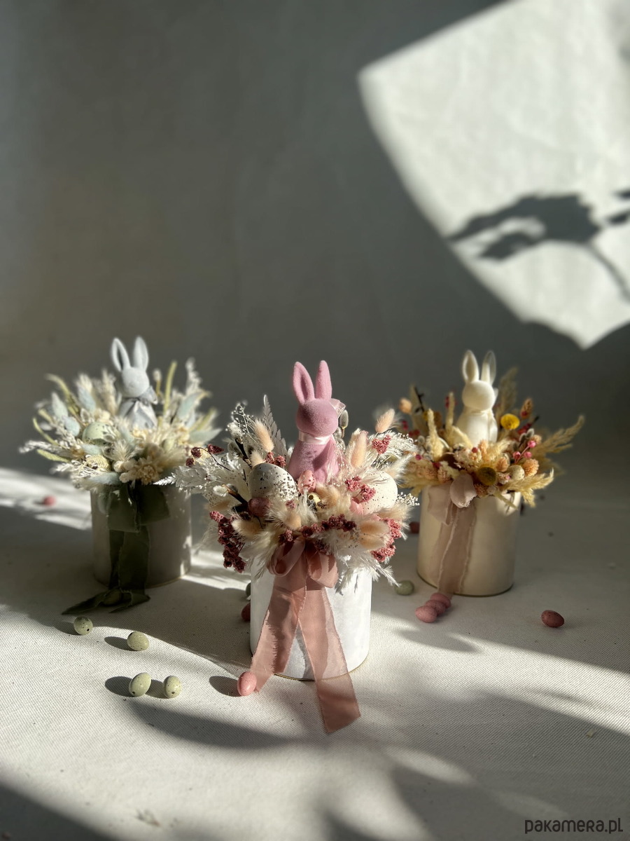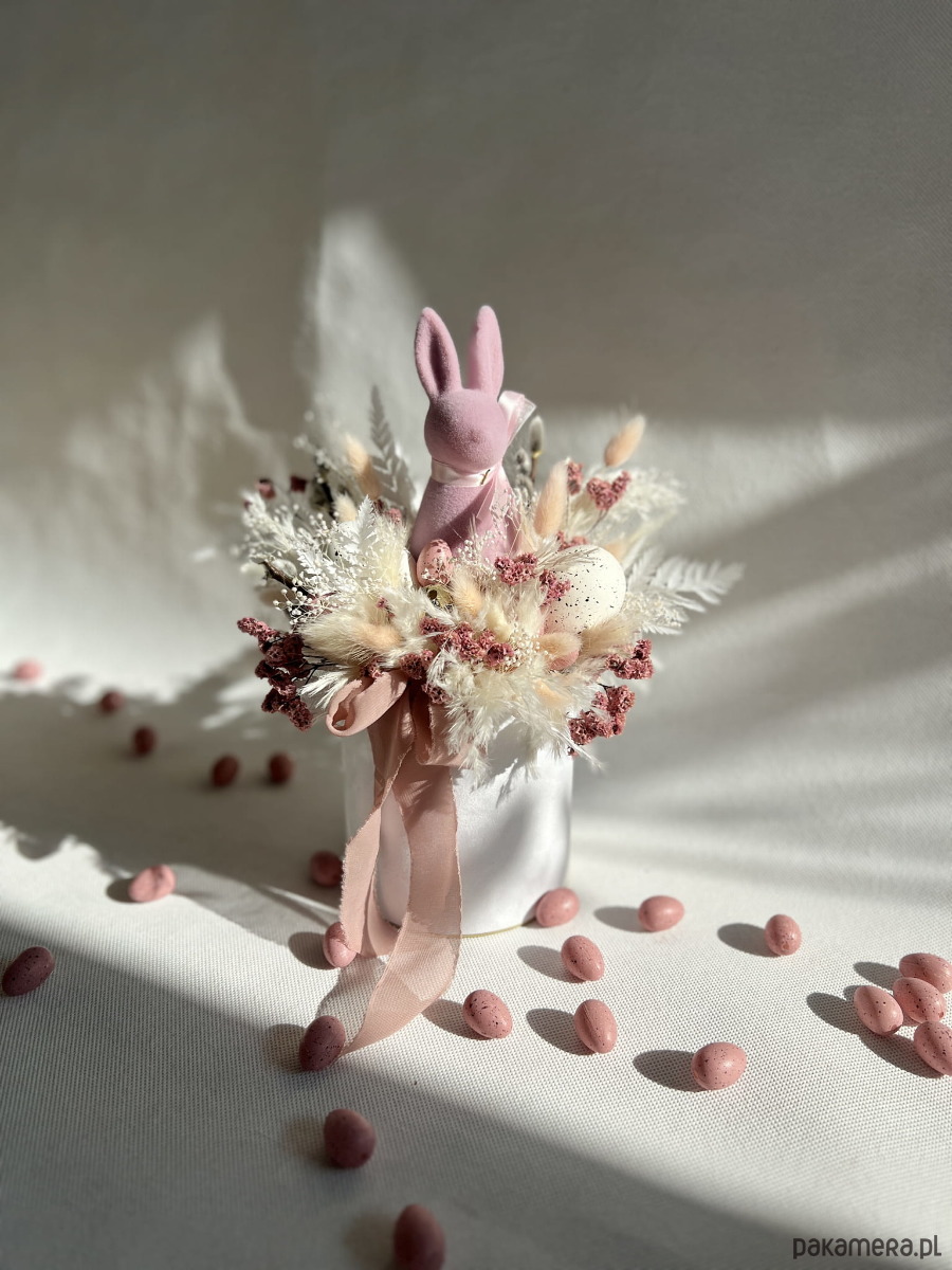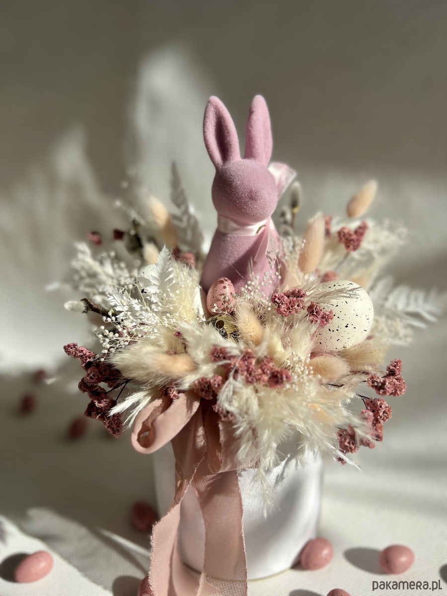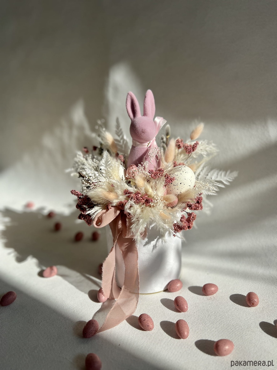 W skład kompozycji wchodzą delikatny królik w liliowym kolorze, trawa pampasowa biała, dmuszek pudrowa brzoskwinia, bazie, piórka perlicze, jajka wydmuszki, stabilizowane limonium, oraz kokardka szyfonowa, które tworzą niepowtarzalny i oryginalny wygląd. Każda roślina suszona zachowuje swój naturalny urok i piękno, dzięki czemu Twój Flowerbox zawsze wygląda świeżo i pięknie.