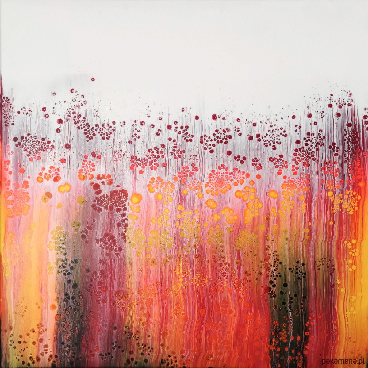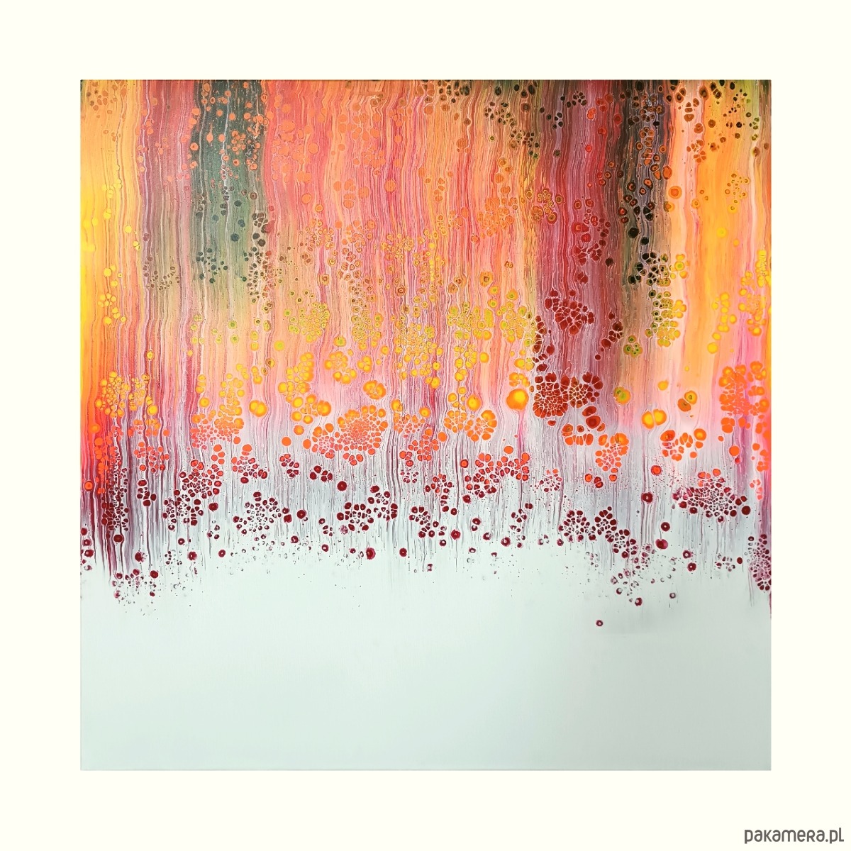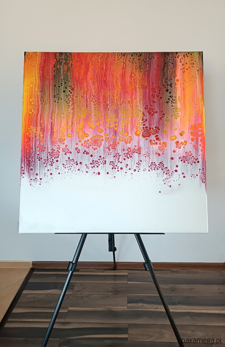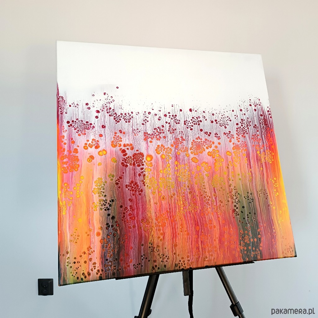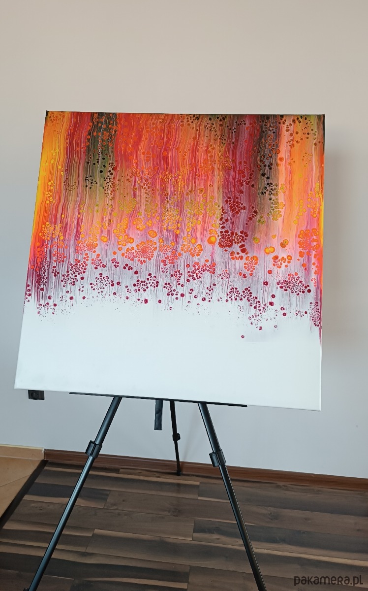 Obraz malowany farbami akrylowymi na dobrej jakości podobraziu bawełnianym, zabezpieczony werniksem satynowym. Użyłam żywych kolorów, w tym pomarańczowego fluorescencyjnego. Dzięki takiej kolorystyce, obraz ożywia przestrzeń, odbija światło. Można go powiesić na 4 różne sposoby, na zdjęciach zaprezentowane są dwie perspektywy. Sygnowany z boku podobrazia i z tyłu. Boki są przedłużeniem obrazu, gotowy do powieszenia bez ramy.