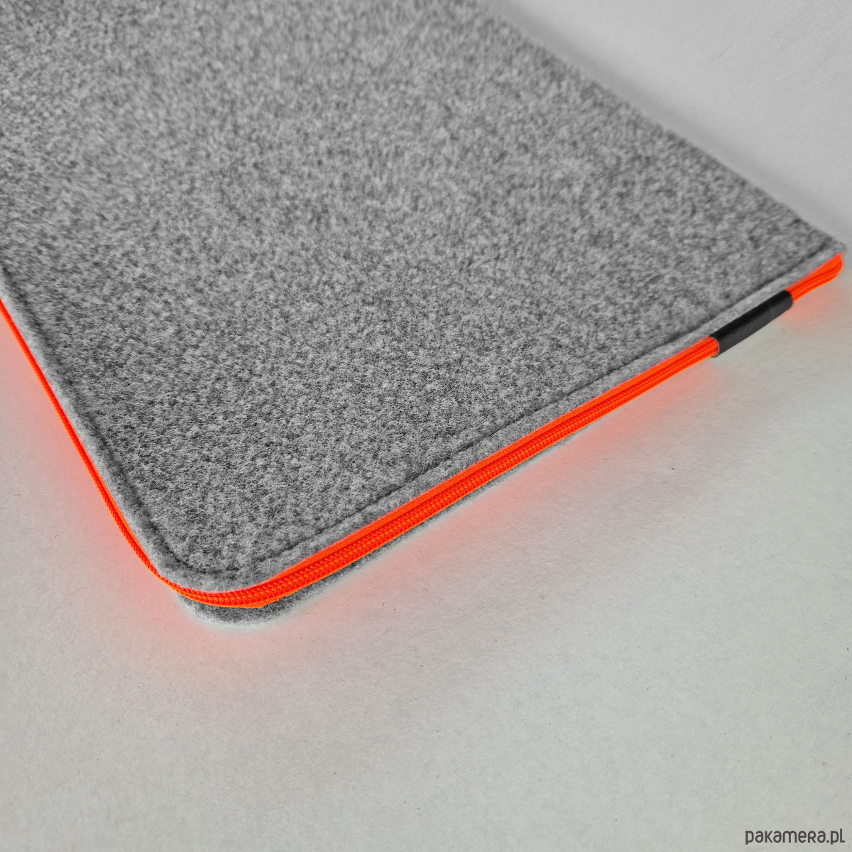 Ręcznie wykonane etui - koperta zapinana na fluo pomarańczowy zamek.