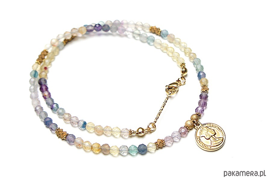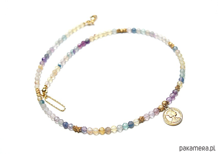 Krótki, delikatny naszyjnik wykonany w całości z pozłacanej stali szlachetnej oraz naturalnych kamieni - fasetowanego fluorytu [4mm], przekładek z hematytu [3 x 2mm]. Naszyjnik o długości ok. 43cm. Biżuteria ozdobnie zapakowana.