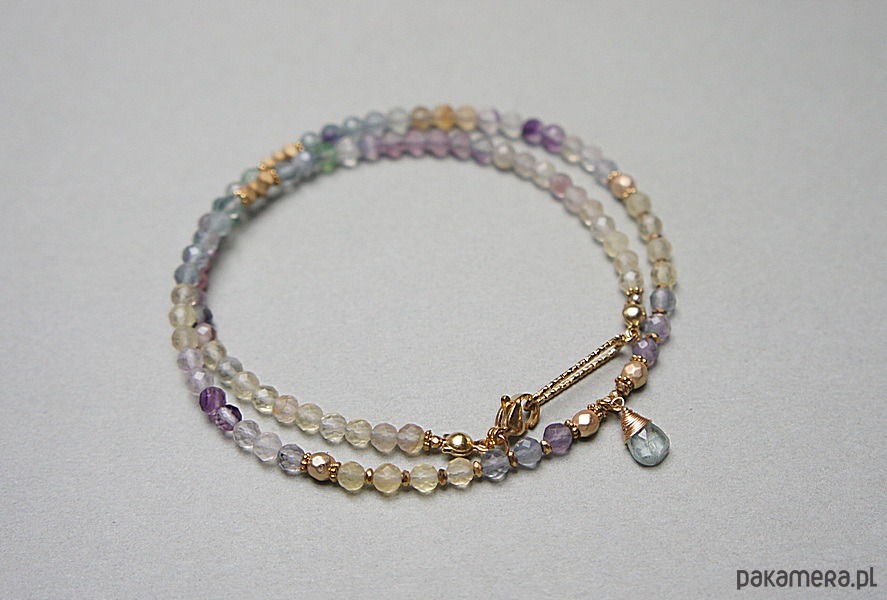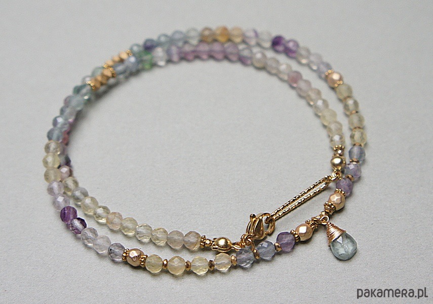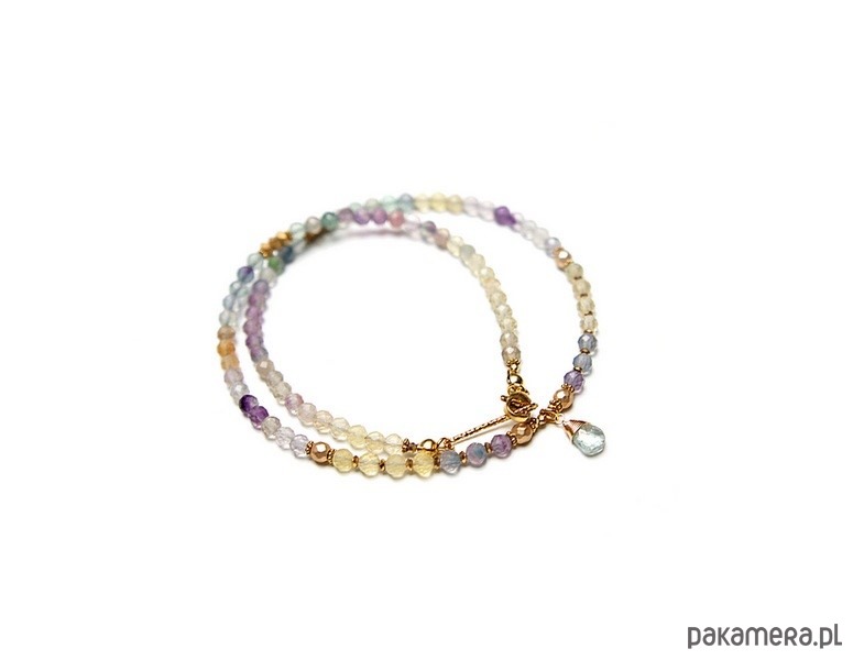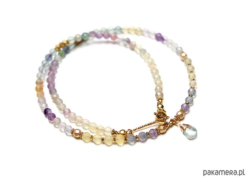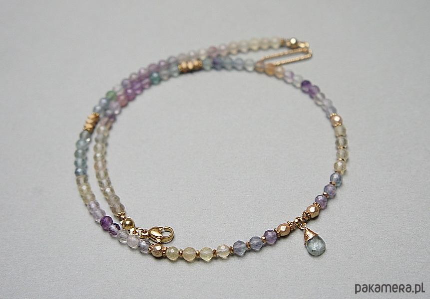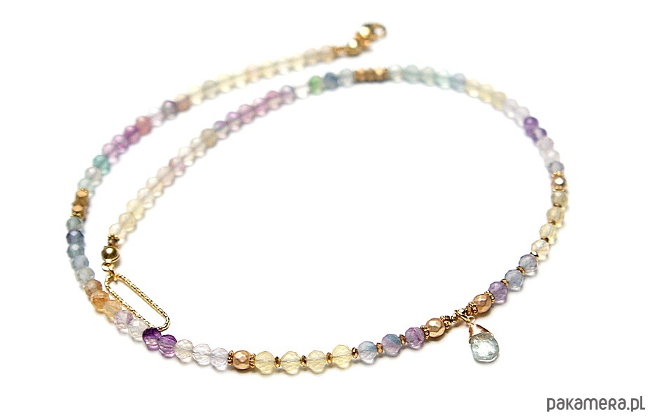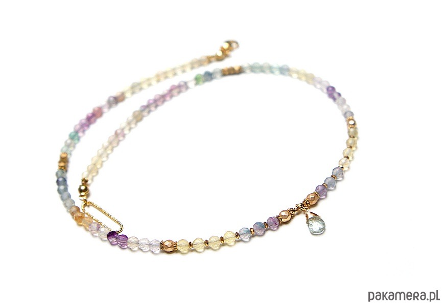 Krótki, delikatny naszyjnik wykonany w całości z pozłacanej stali szlachetnej oraz naturalnych kamieni - fasetowanego fluorytu [4mm], przekładek z hematytu [1mm, 4mm oraz 3 x 2mm] oraz zawieszki z brioletki naturalnego topazu niebieskiego. Naszyjnik o długości ok. 44,2cm. Biżuteria ozdobnie zapakowana.
