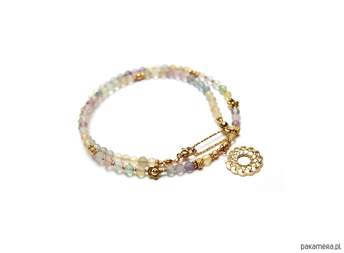 Krótki, delikatny naszyjnik wykonany w całości z pozłacanej stali szlachetnej oraz naturalnych kamieni - fasetowanego fluorytu [4mm], fasetowanego, platerowanego hematytu o matowej powierzchni [2mmi 4 mm], przekładek z hematytu [1mm oraz kwiatki 6mm]. Naszyjnik o długości ok. 43cm.