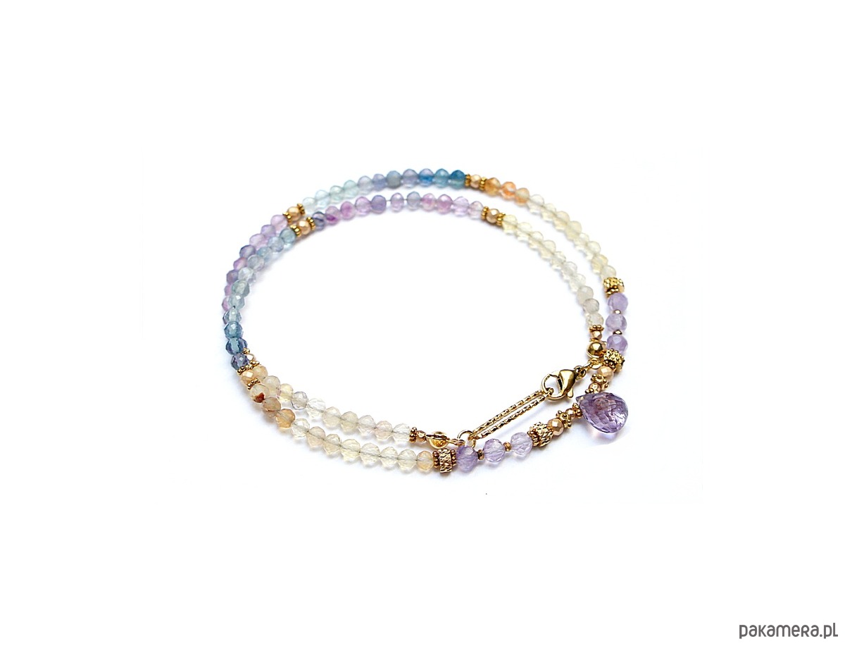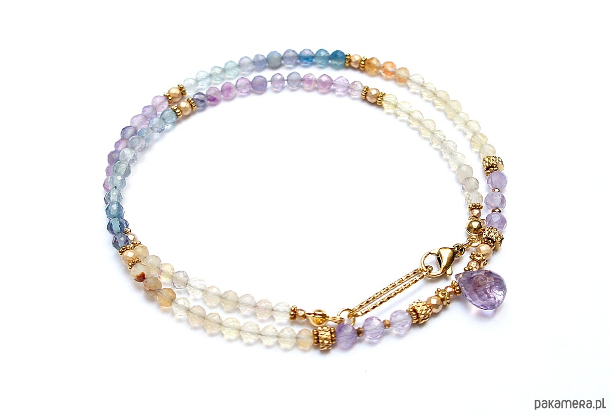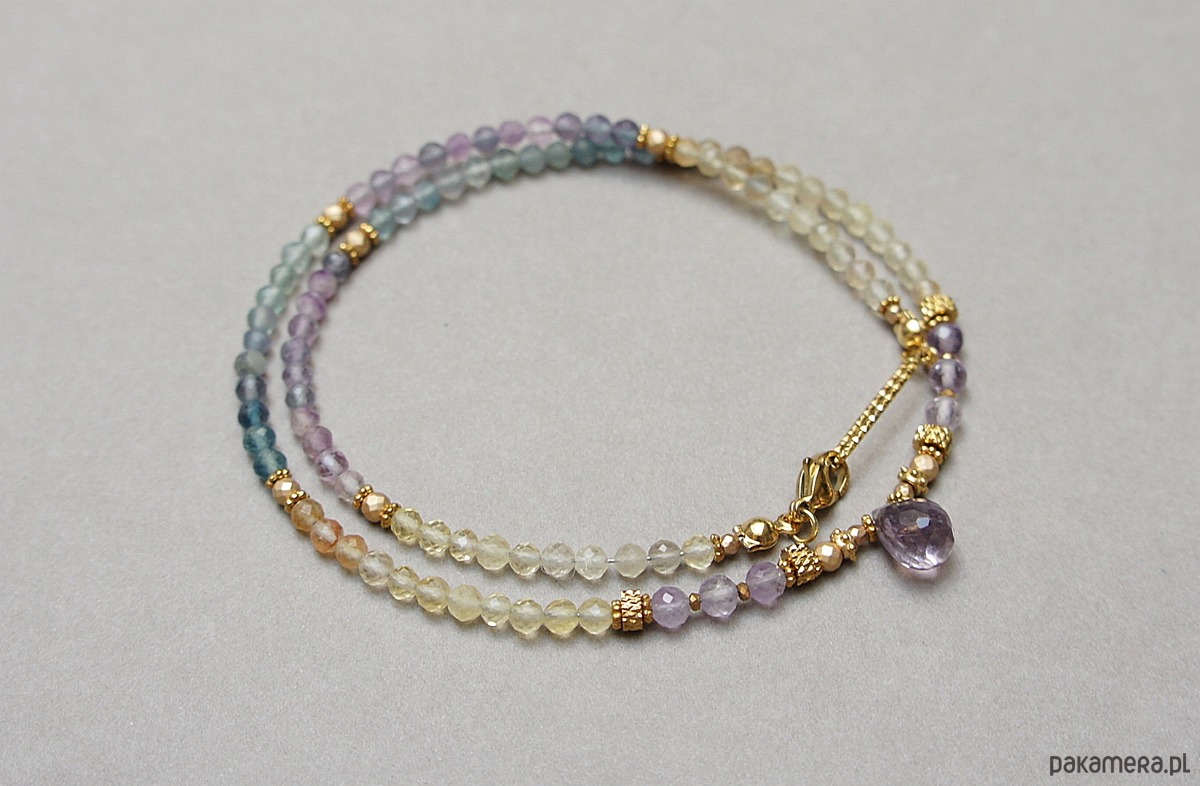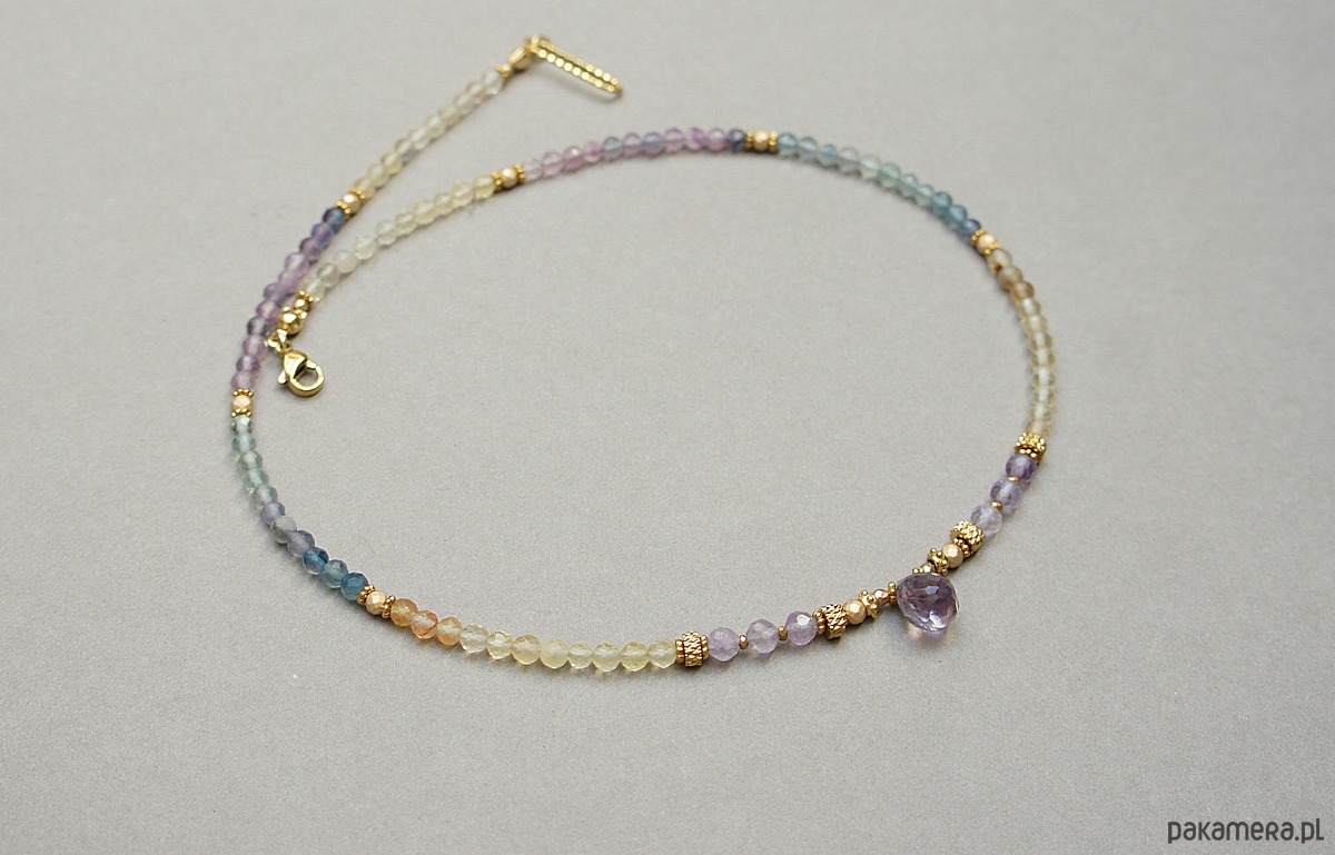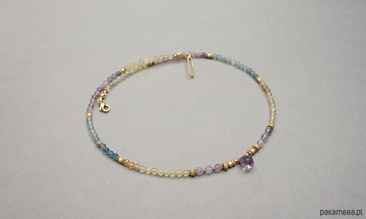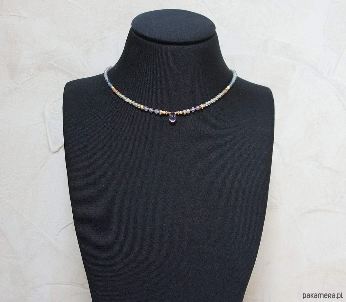 Krótki, delikatny naszyjnik wykonany w całości z pozłacanej stali szlachetnej oraz naturalnych kamieni - fasetowanego fluorytu [4mm], fasetowanego, platerowanego hematytu o matowej powierzchni [2mm i 3 mm], przekładek z hematytu [1mm] oraz fasetowanej brioletki ametrynu. Naszyjnik o długości ok. 43cm.