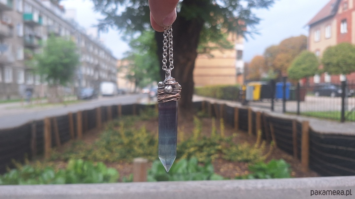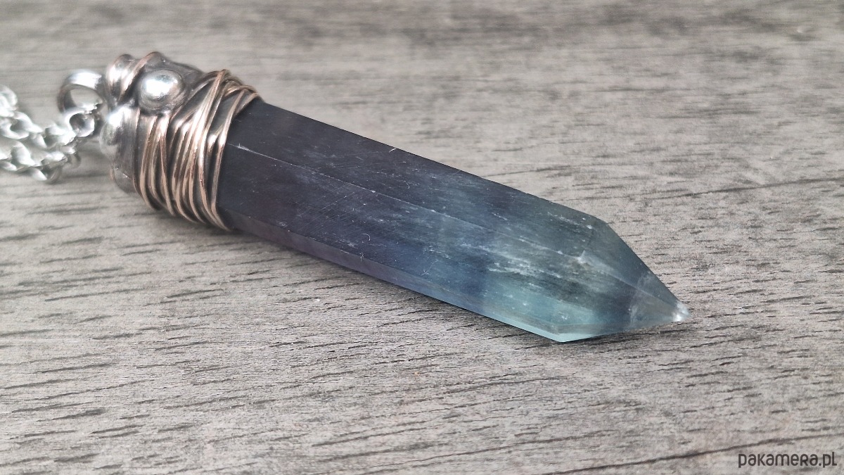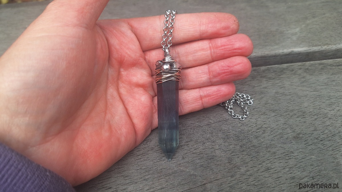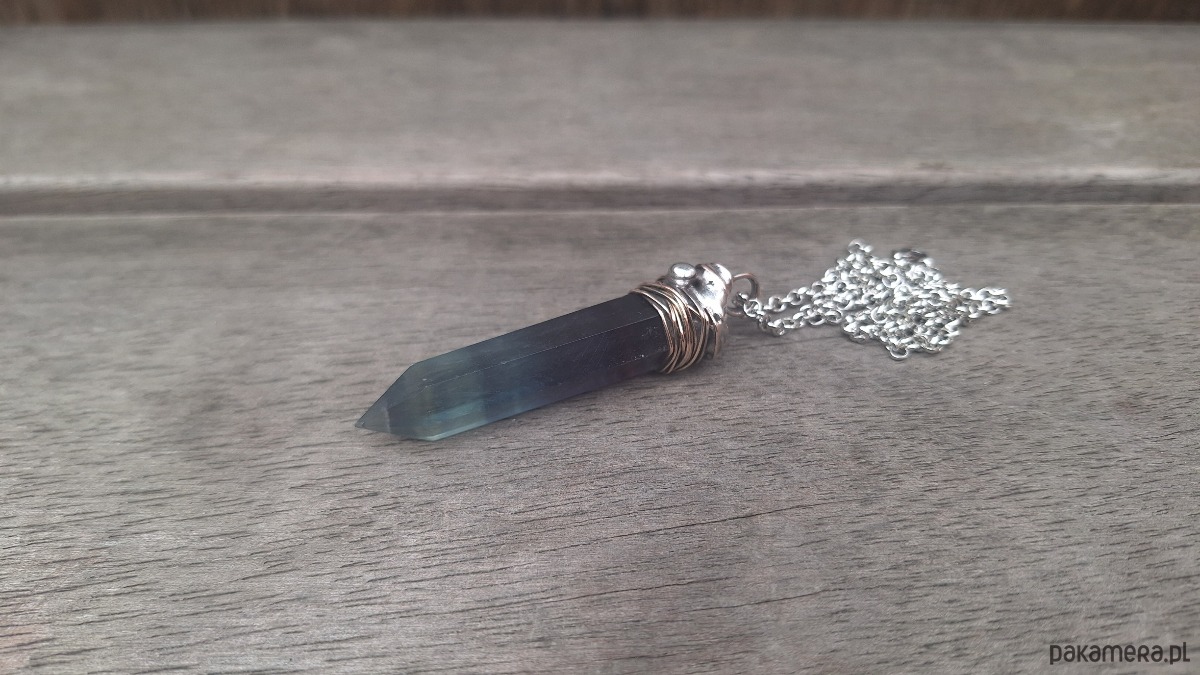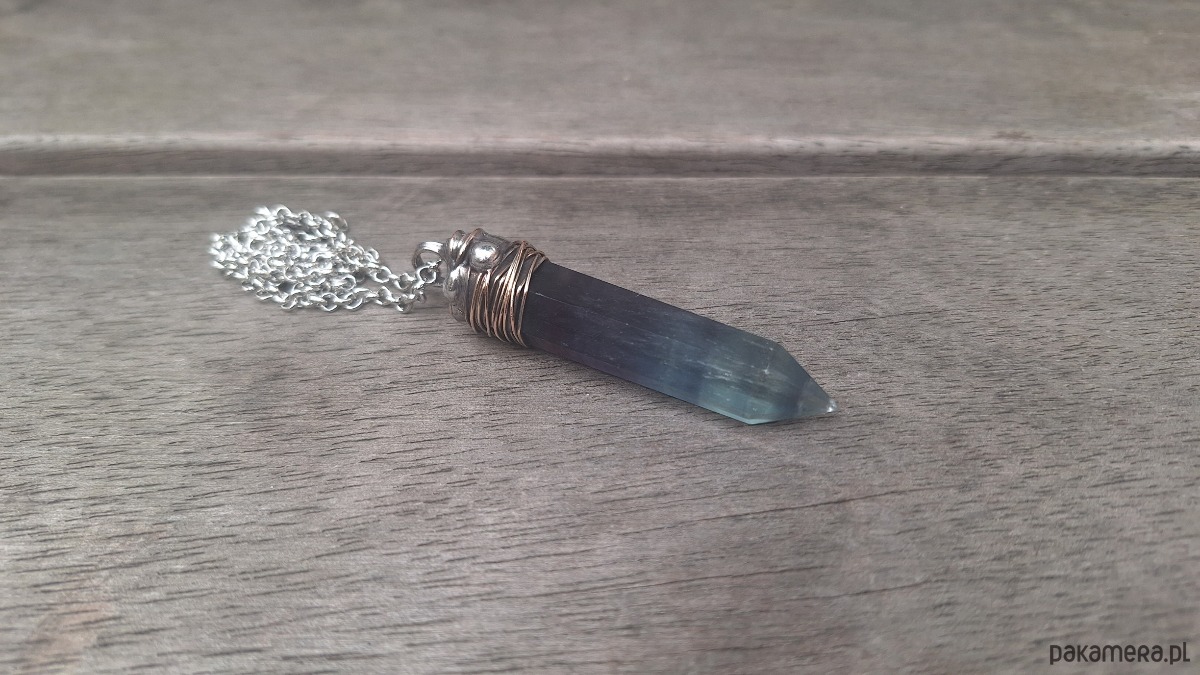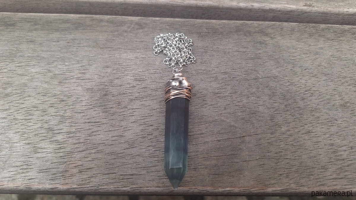 Wisiorek wykonany z miedzi, cyny i fluorytu. Wymiary ok. 6 na 1.3 cm. Zawieszony na łańcuszku o długości ok. 50 cm.