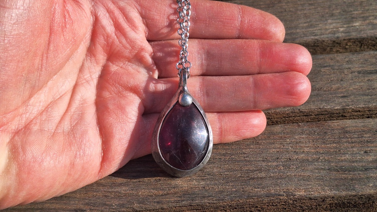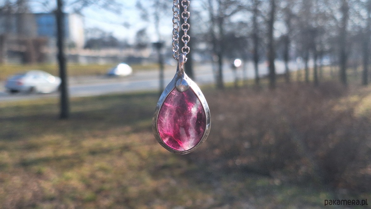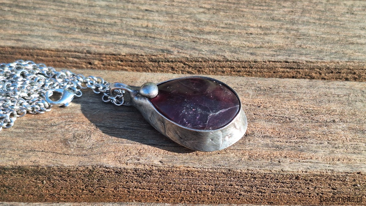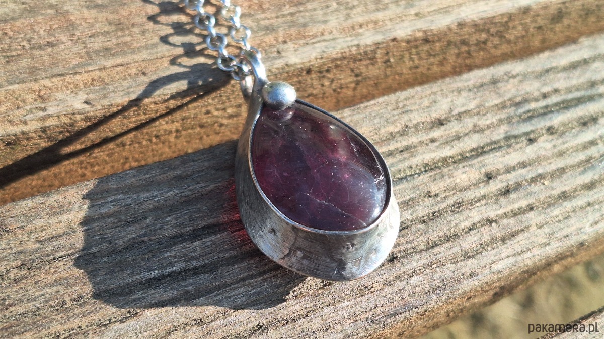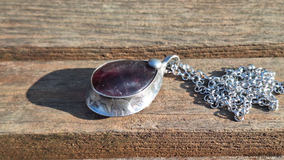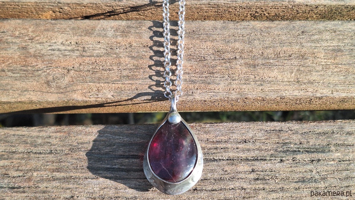 Wisiorek wykonany z miedzi, cyny i fluorytu. Wymiary ok. 4 na 2.5 cm. Zawieszony na łańcuszku o długości ok. 50 cm.