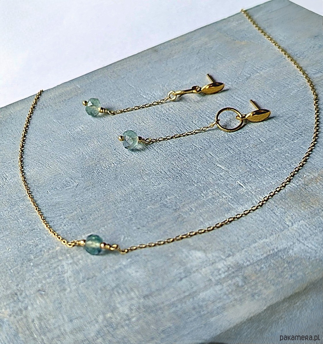 Naszyjnik i kolczyki na bazie łańcuszka wykończone świetlistymi kamykami fluorytu w kolorze zielono-morskim. Wykonane ze złoconego srebra.