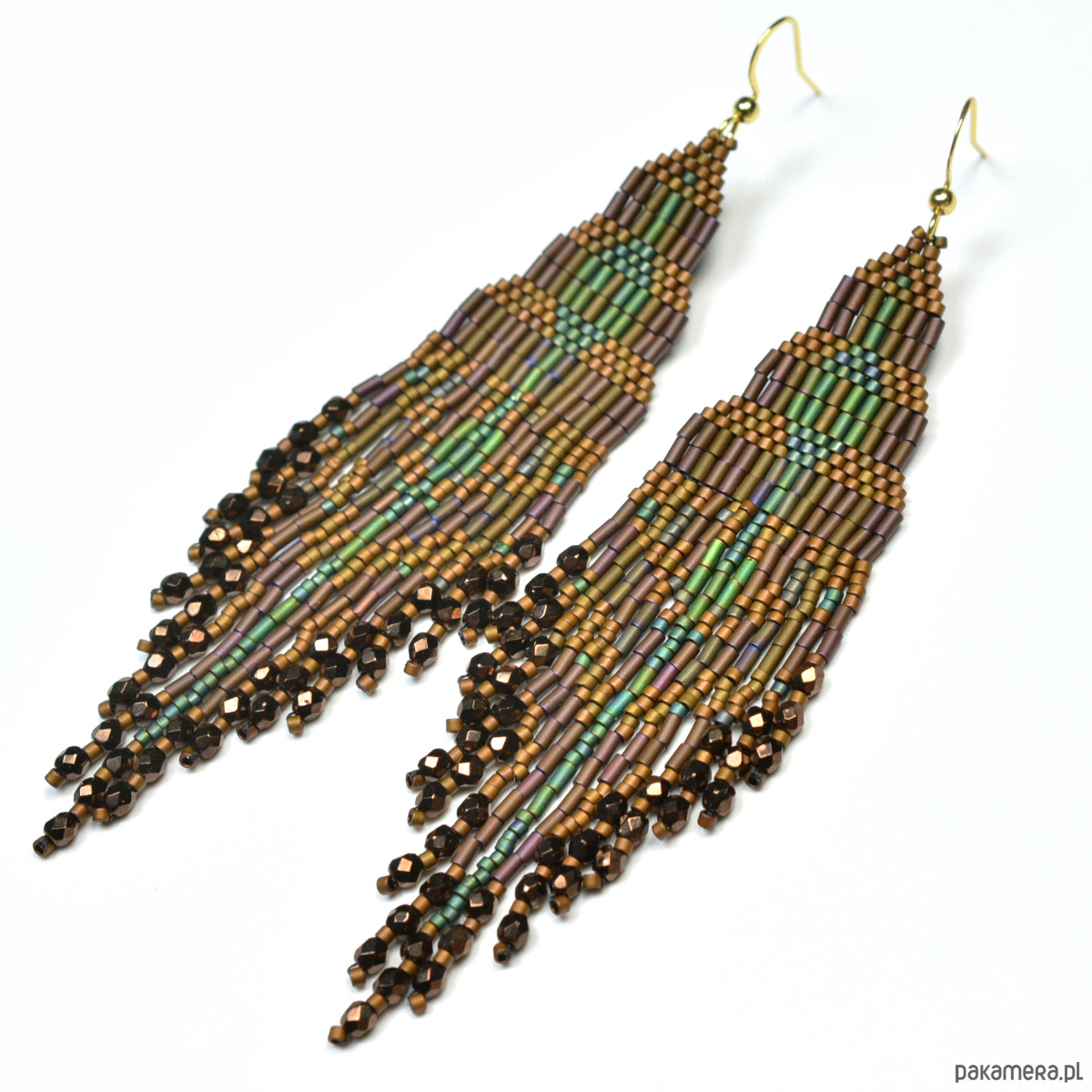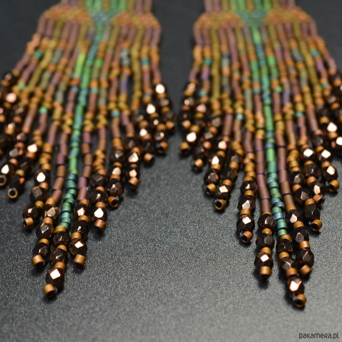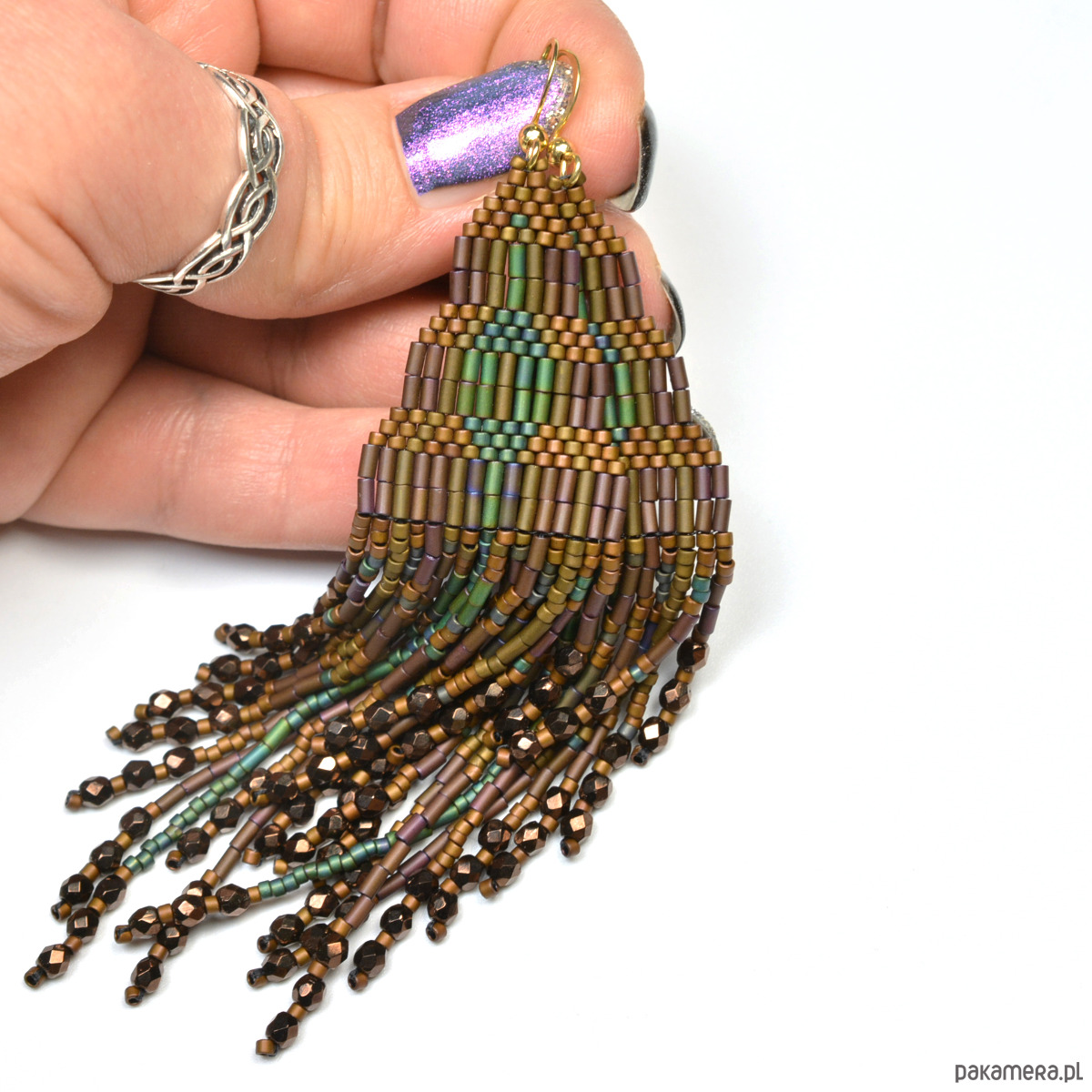 Wyplotłam je z najwyższej jakości japońskich koralików Toho w odcieniach brązu złamanego zielenią (w rzeczywistości brązy są bardziej stonowane niż widać na zdjęciach), a we frędzle wplotłam fasetowane czeskie kryształki fire polish.