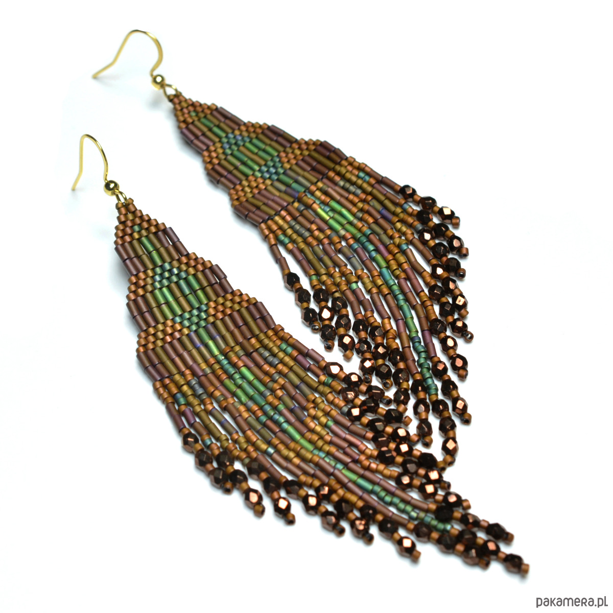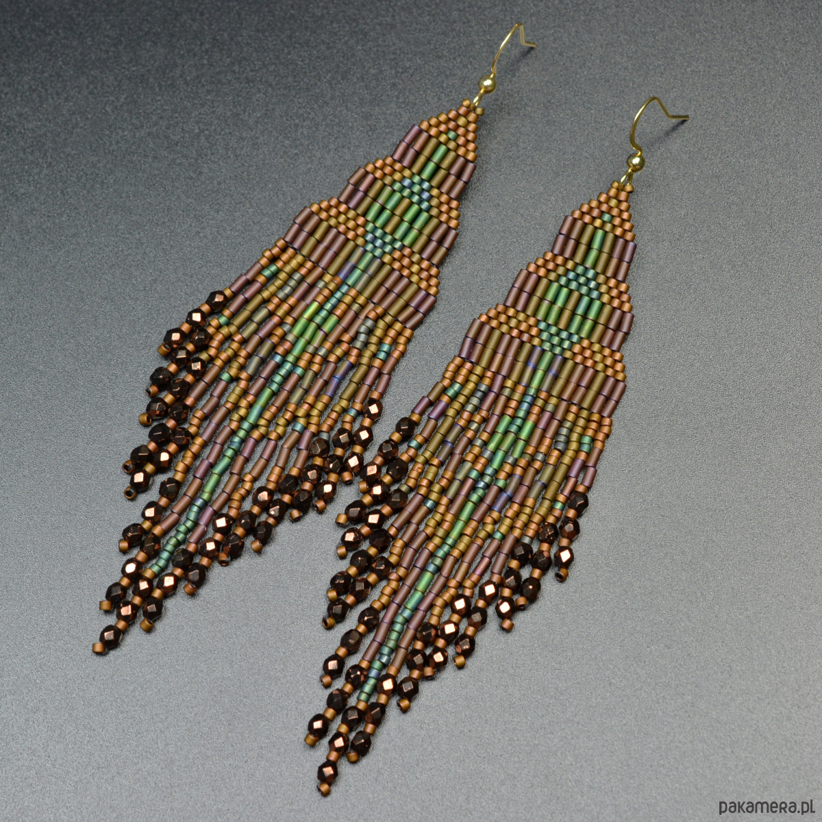 Foghar, brązowo-zielone "indiańskie" kolczyki, beading