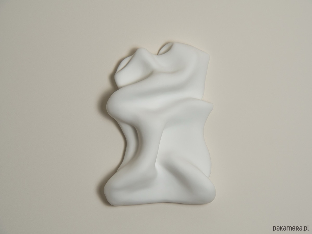 Ta praca wyraża delikatność ruchu w trwałej formie. Gładka, jedwabista powierzchnia i spokojny, biały odcień tworzą subtelne poczucie równowagi i światła.