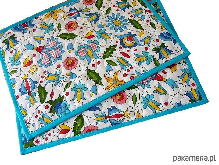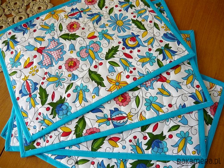 Komplet mat -podkładek obiadowych uszytych z bawełny drukowanej w motywy kaszubskie na białym tle. Tkaniny nie farbują, nie tracą kolorów po praniu. Obszyte są dopasowaną kolorystycznie lamówką. Szyte z trzech warstw, pikowane maszynowo. Maty można śmiało prać i prasować, wypełnienie nie zmienia swoich właściwości. Rozm. ok. 39 x 27cm. KOMPLET 4 SZTUKI. Na żywo dużo ładniej się prezentują:) Polecam serdecznie! Posłużą na pewno wiele lat!