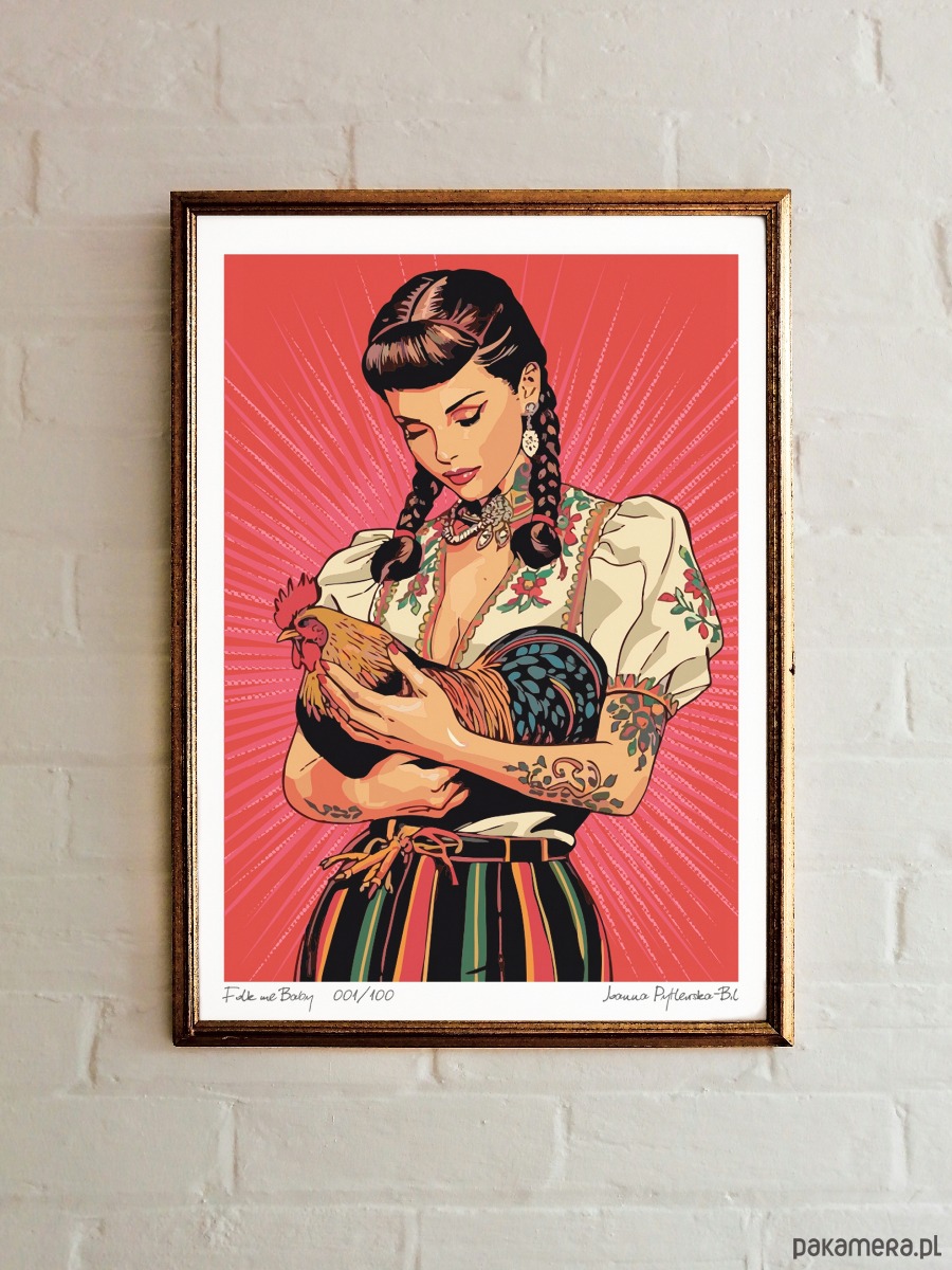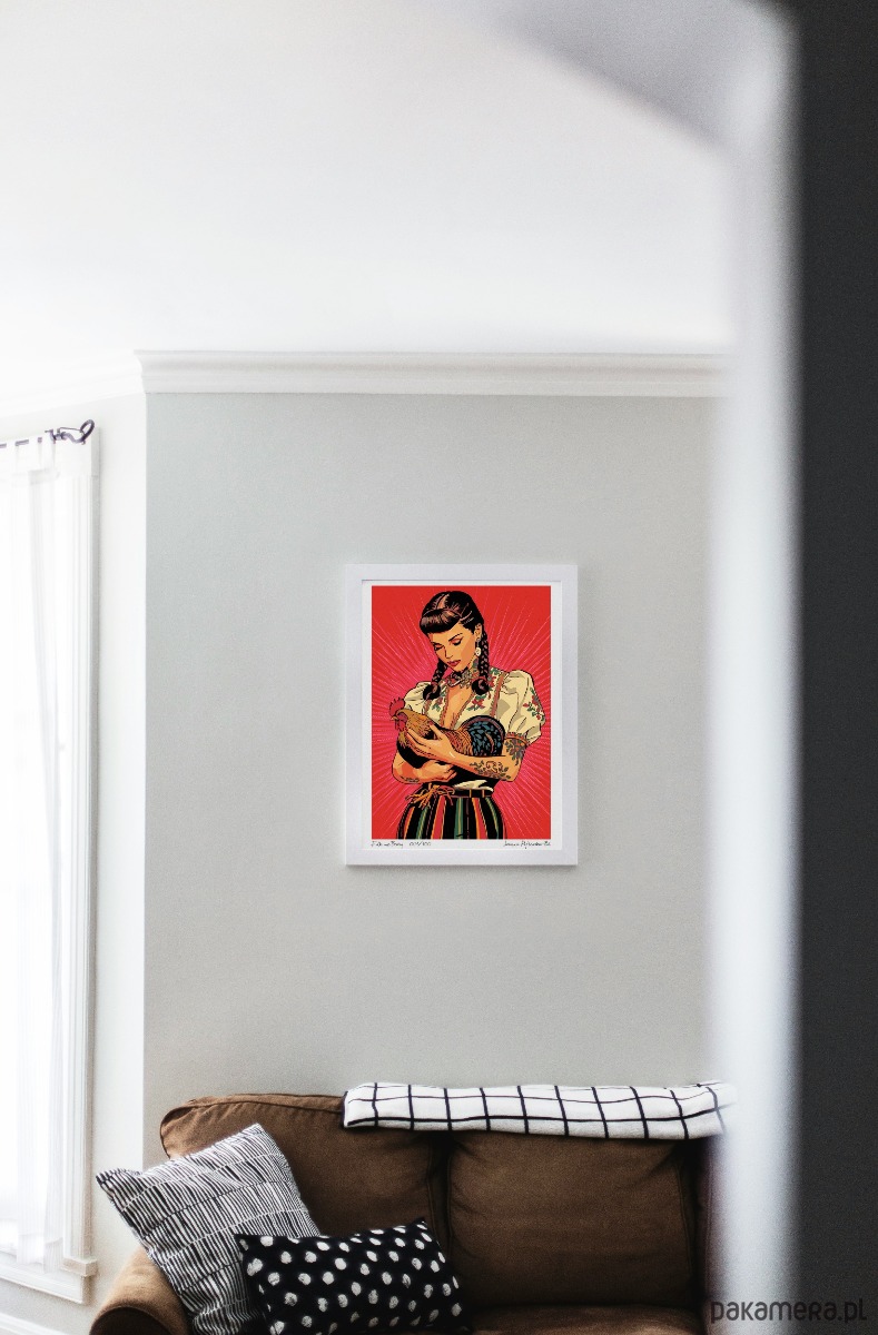 Kobieta z plakatu ma w sobie coś z wiejskiej dziewczyny i coś z gwiazdy rockabilly — warkocze i pasiasta zapaska spotykają tu czerwoną szminkę, tatuaże i koguta na rękach. To nie skromna panna, ale nowoczesna ikona kobiecości, która bierze tradycję w swoje ręce, przepisuje ją na nowo i po swojemu —