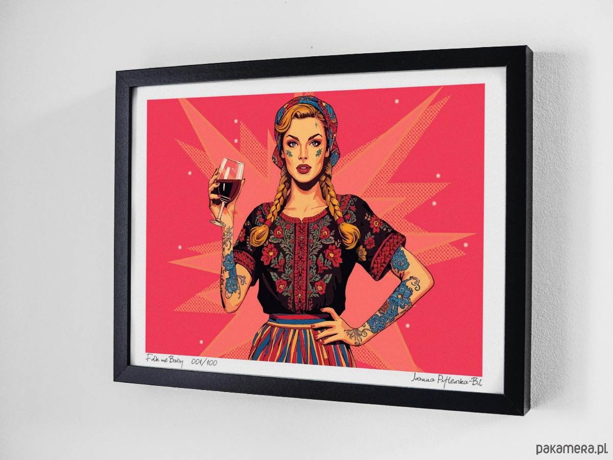 Kobieta z plakatu ma w sobie coś z wiejskiej dziewczyny i coś z gwiazdy rockabilly — warkocze i pasiasta zapaska spotykają tu czerwoną szminkę, tatuaże i kieliszek czerwonego wina. To nie skromna panna, ale nowoczesna ikona kobiecości, która bierze tradycję w swoje ręce, przepisuje ją na nowo i po swojemu —