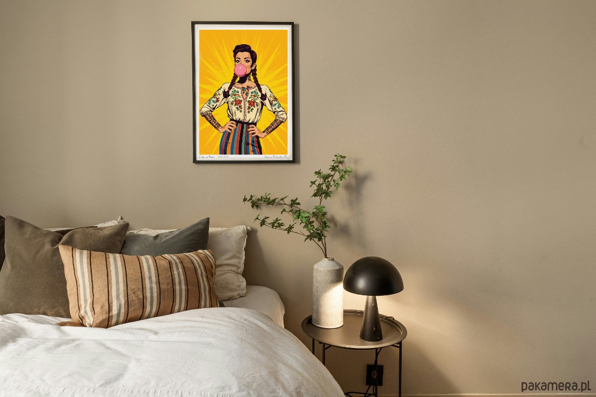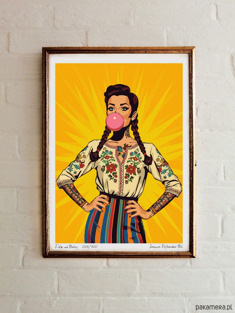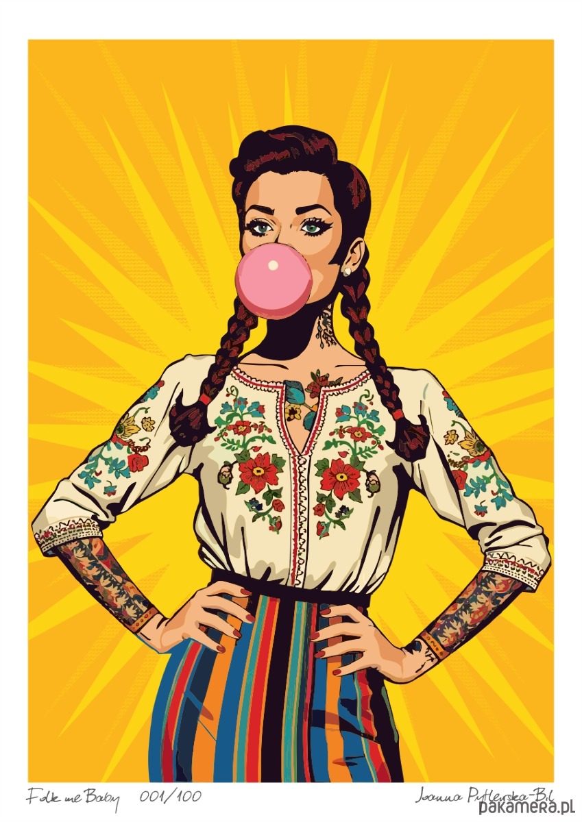 Kobieta z plakatu ma w sobie coś z wiejskiej dziewczyny i coś z gwiazdy rockabilly — warkocze i pasiasta zapaska spotykają tu czerwoną szminkę, tatuaże i gumę balonową. To nie skromna panna, ale nowoczesna ikona kobiecości, która bierze tradycję w swoje ręce, przepisuje ją na nowo i po swojemu —