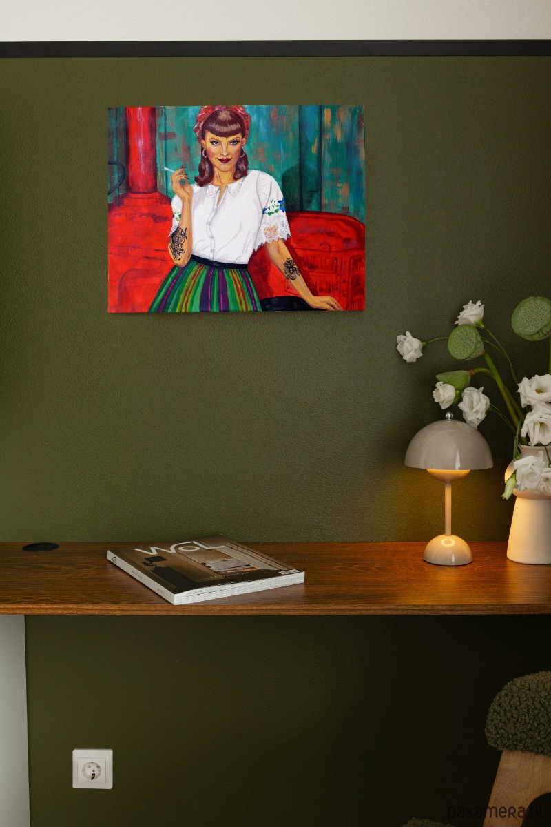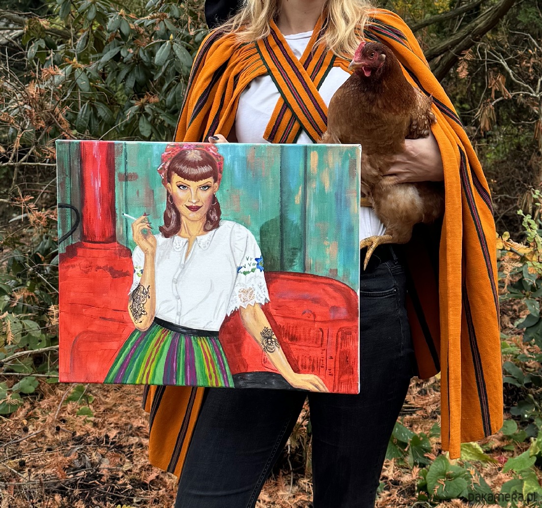 Ma w sobie coś z dziewczyny z pola i coś z gwiazdy rockabilly — warkocze, pasiasta zapaska i chusta w kwiaty spotykają tu czerwoną szminkę, tatuaże i papierosa w dłoni. To nie panna z wiejską skromnością, ale nowoczesna ikona kobiecości, która bierze tradycję w swoje ręce, przepisuje ją na nowo i po swojemu —