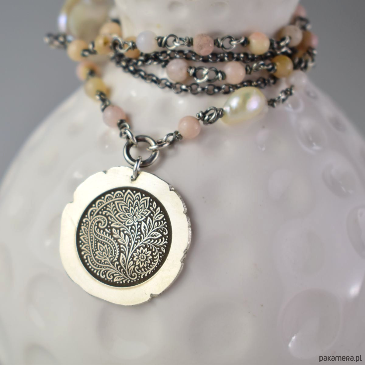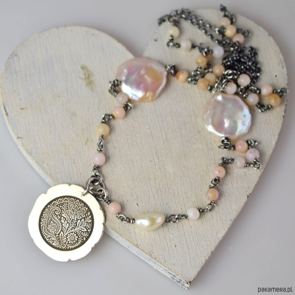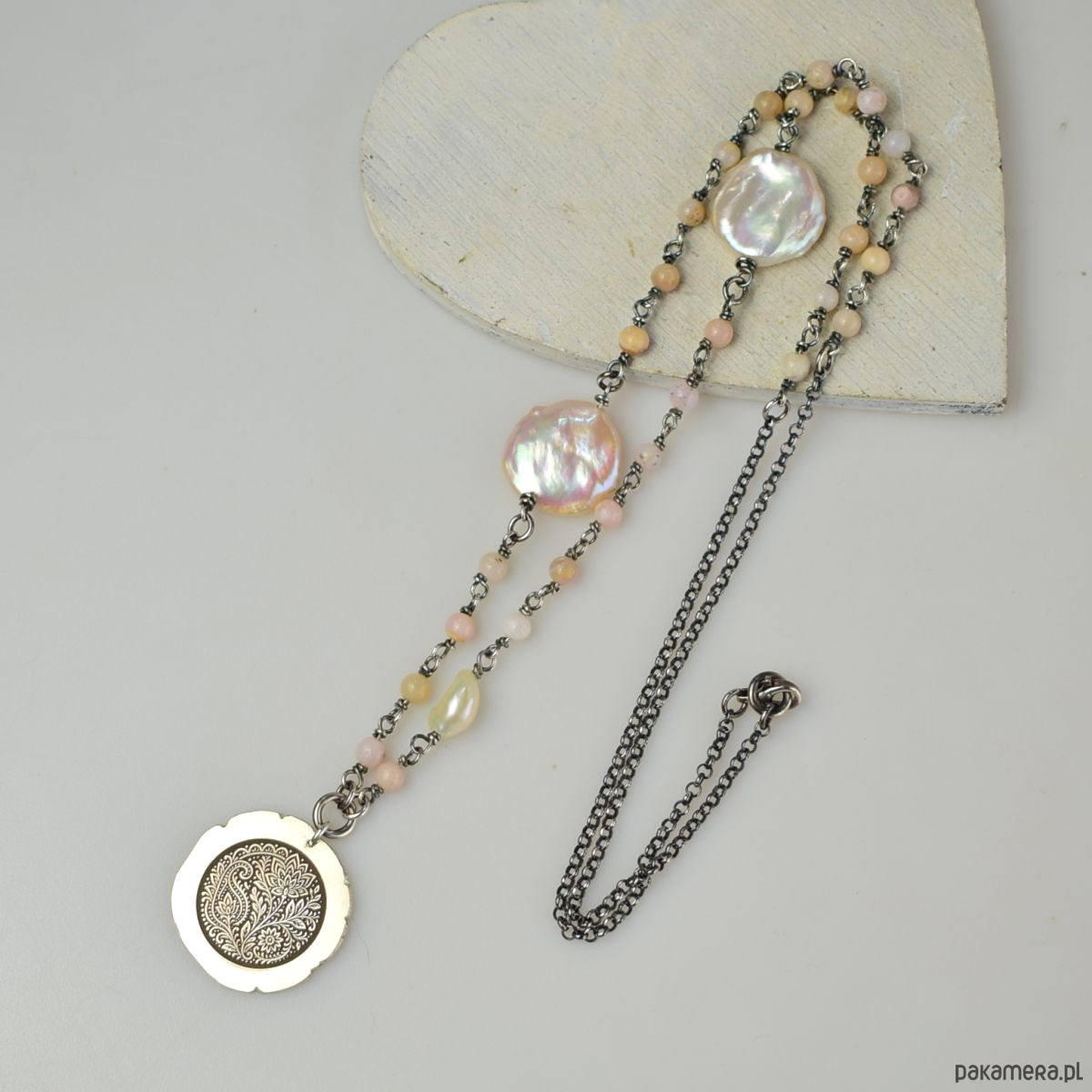 Naszyjnik wykonany w całości ze srebra (próba 925) z opalem różowym i perłami. Wisiorek został zaprojektowany i wykonane od początku w pracowni Sunflower. Wisior celowo jest "nieidealny" co dodaje mu niepowtarzalności. Średnica monety ok 2,5 cm. Długość naszyjnika 66 cm. Biżuteria zostanie ozdobnie zapakowana.