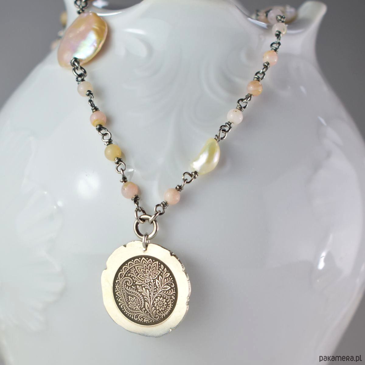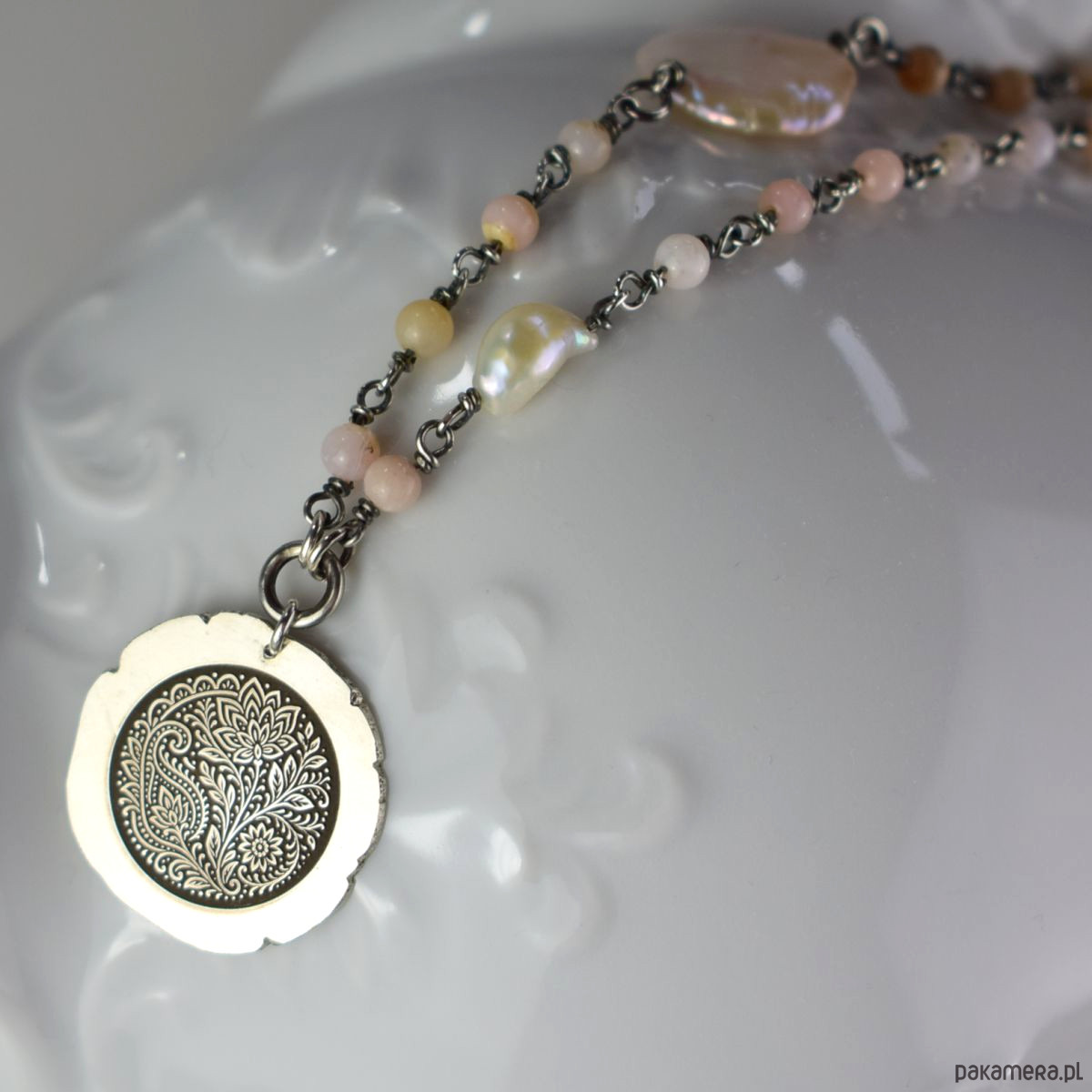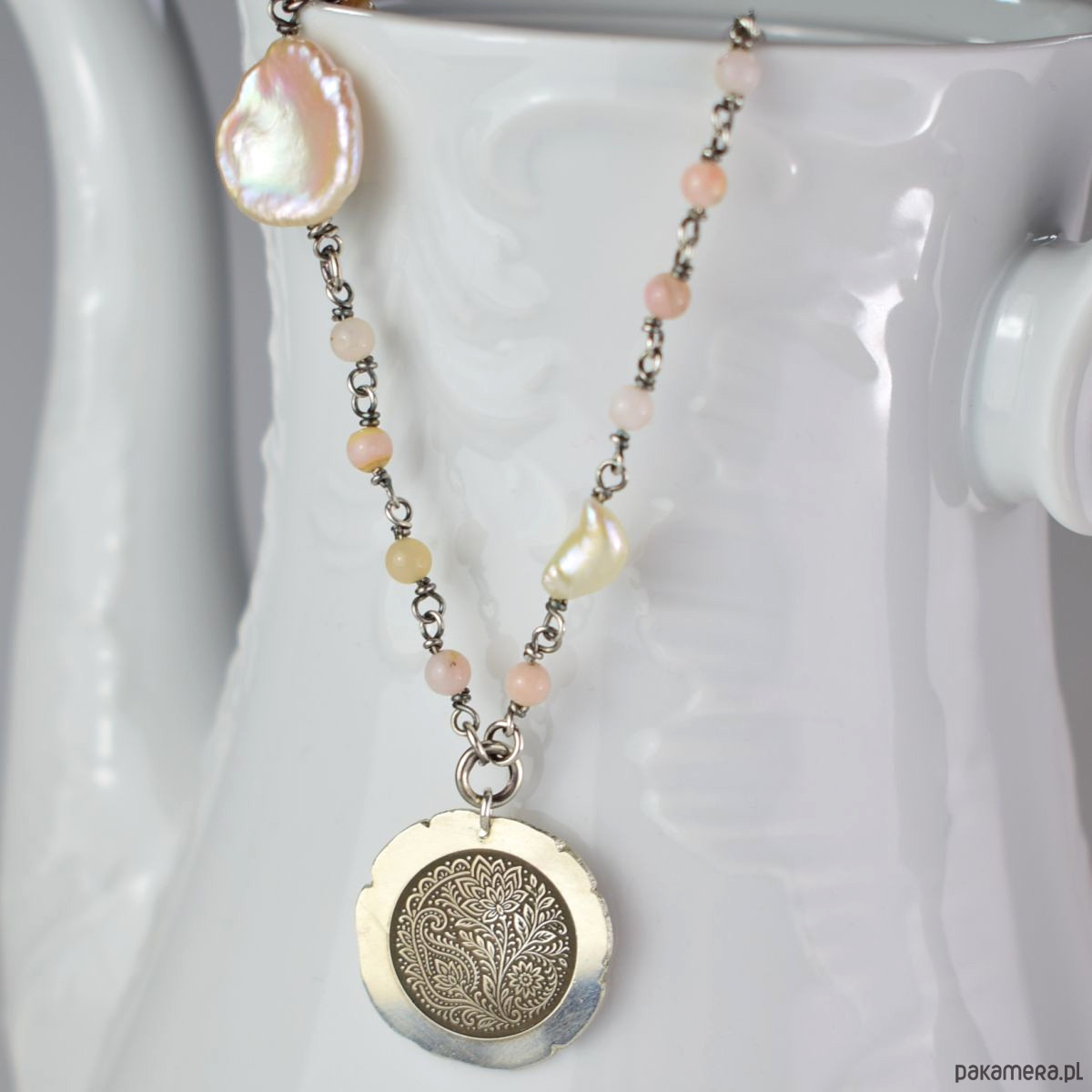 Folk - srebrny naszyjnik z opalem różowym i perłami