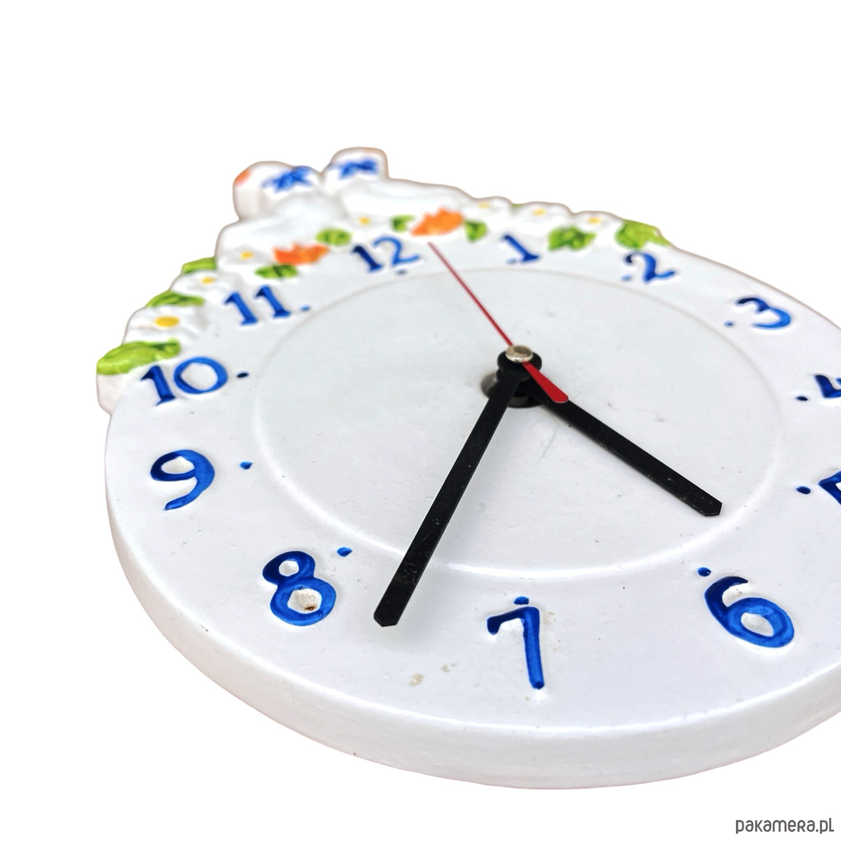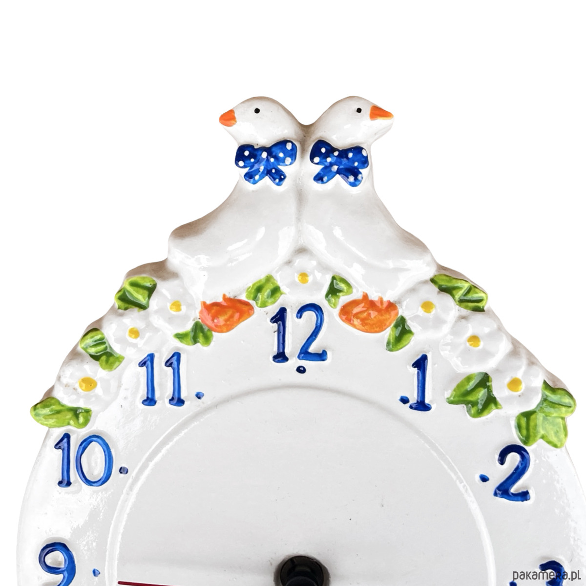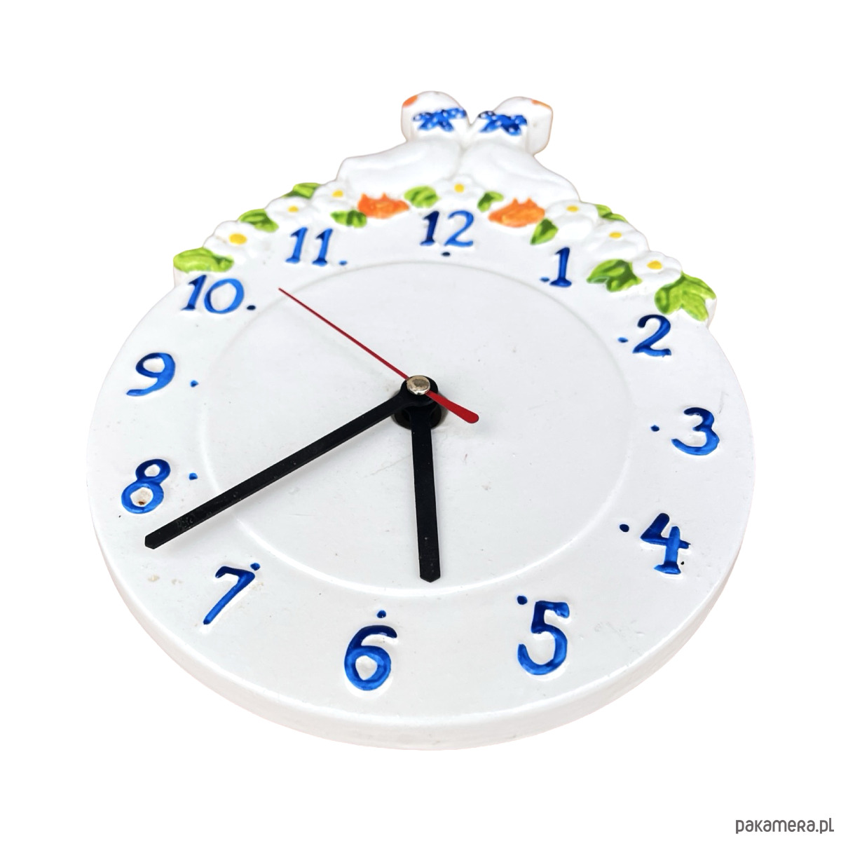 Sielski zegar wiszący typ 9229 Kienzle wyprodukowany w Niemczech w latach 80. ubiegłego wieku. Zegar wykonany z ceramiki, malowana ręcznie. Przedmiot w stanie dobrym, nosi normalne ślady użytkowania. Mechanizm w pełni sprawny. Mechanizm na pojedynczą baterię AA.