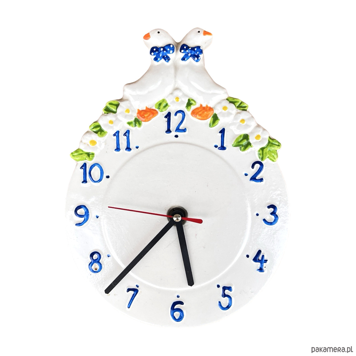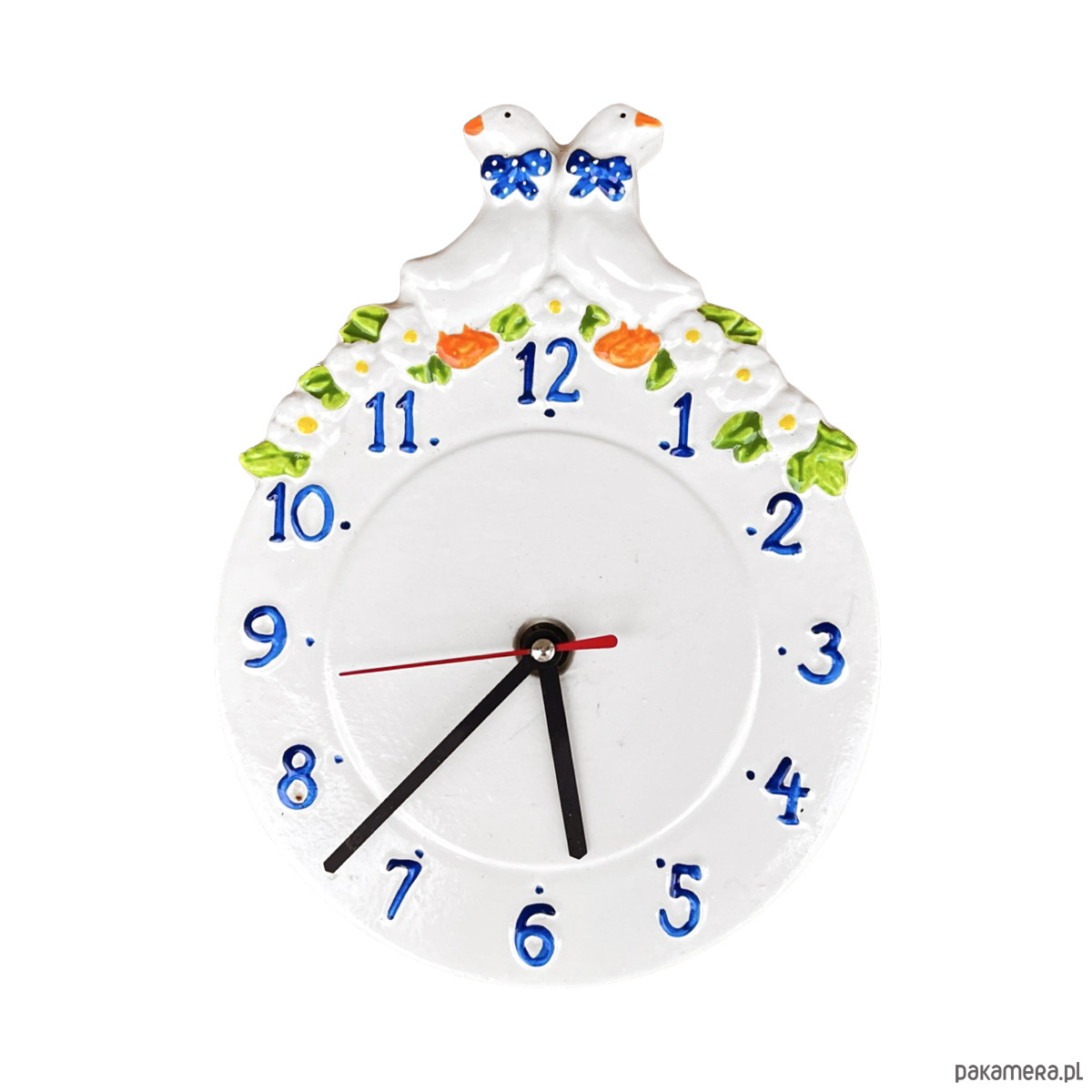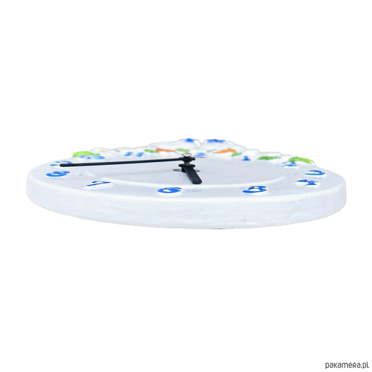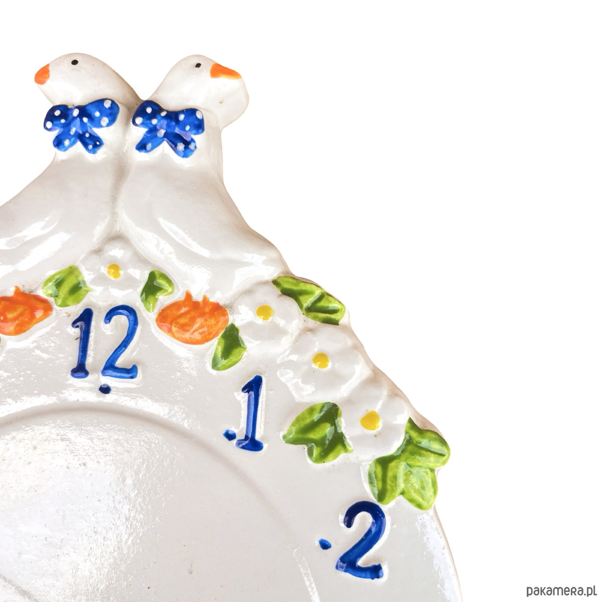 Sielski zegar wiszący typ 9229 Kienzle wyprodukowany w Niemczech w latach 80. ubiegłego wieku. Zegar wykonany z ceramiki, malowana ręcznie. Przedmiot w stanie dobrym, nosi normalne ślady użytkowania. Mechanizm w pełni sprawny. Mechanizm na pojedynczą baterię AA.