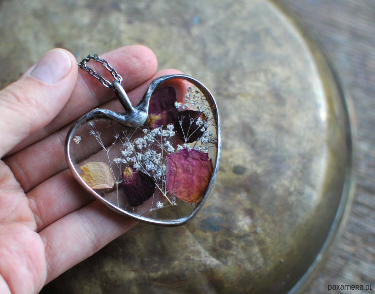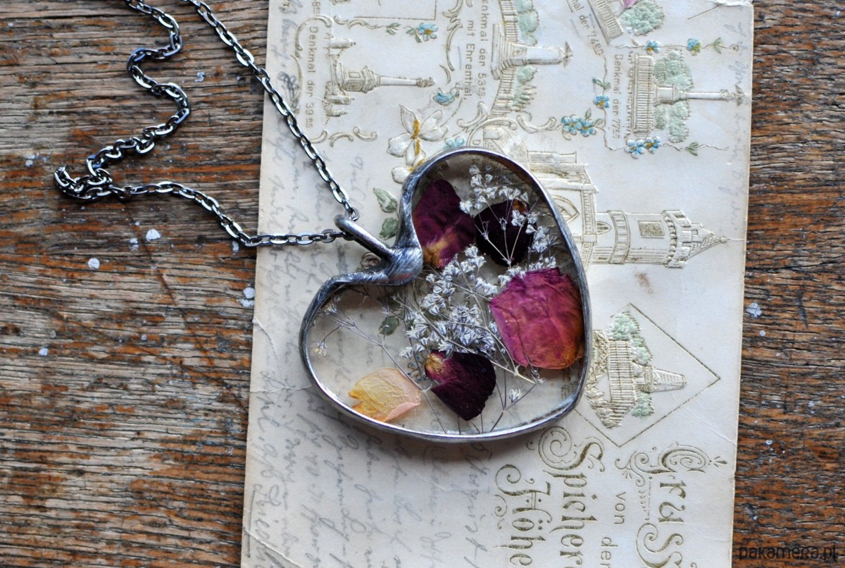 Za wypukłym szkłem umieszczony została umieszczona unikalna kompozycja z suszonych kwiatów. Delikatny wisiorek dla romantycznej duszy :)