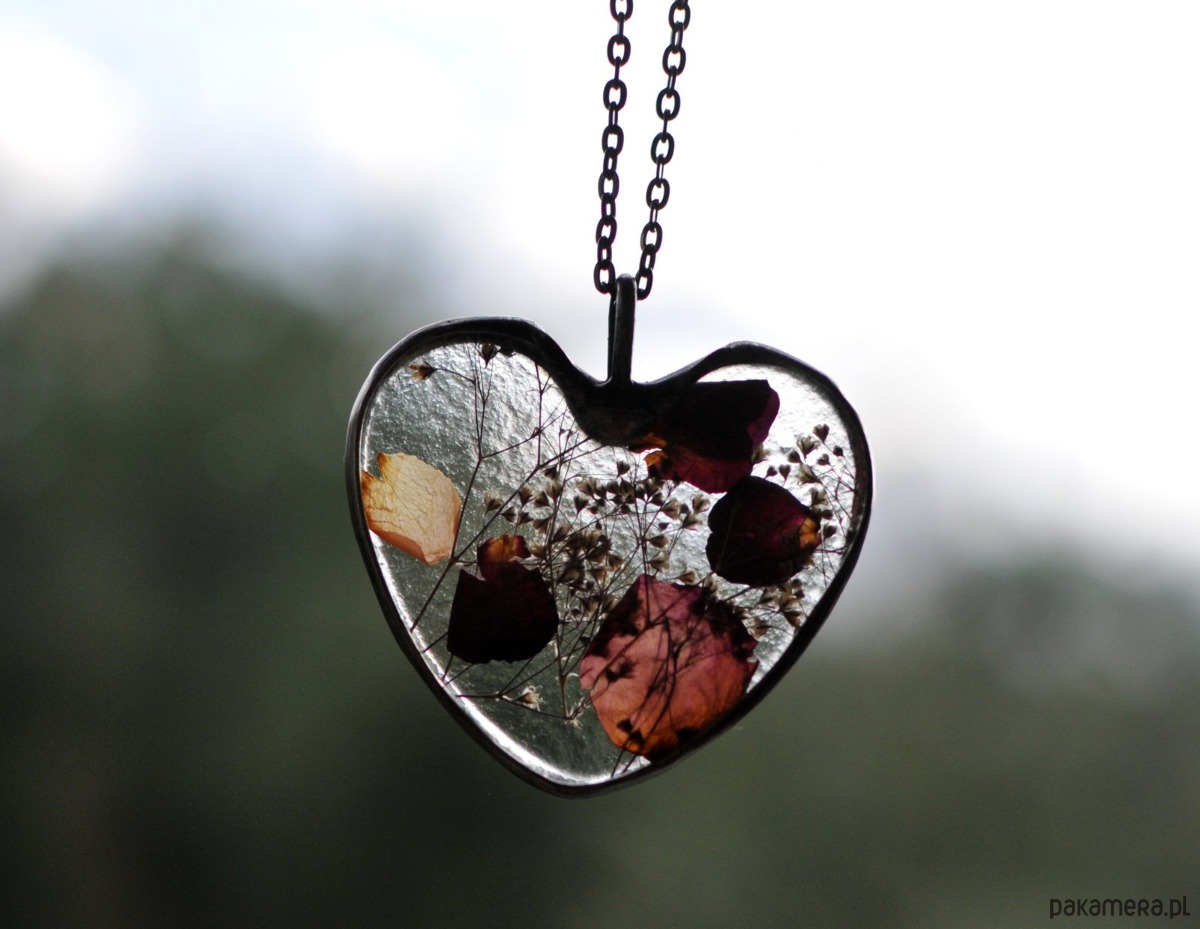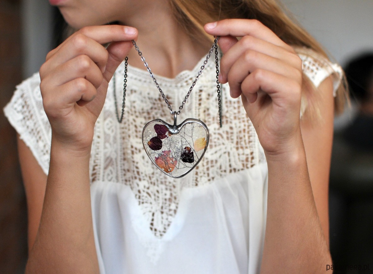Za wypukłym szkłem umieszczony została umieszczona unikalna kompozycja z suszonych kwiatów. Delikatny wisiorek dla romantycznej duszy :)