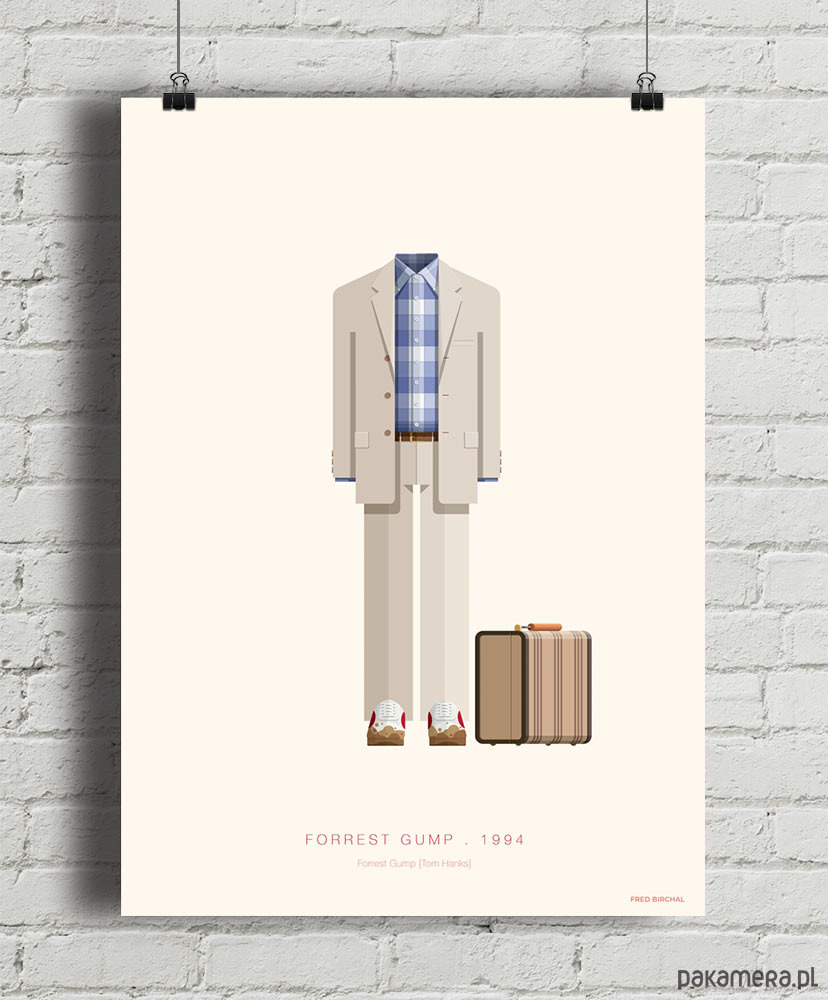 Plakat inspirowany filmem Forrest Gump, reż. Robert Zemeckis. Przedstawia strój głównej postaci odtwarzanej przez Toma Hanksa, za którą to rolę w 1994 roku otrzymał Oscara. Stonowane kolory plakatu sprawdzą się w każdym wnętrzu. Każdy element kostiumu odtworzony został z geometryczną precyzją i nutą humoru - jak np. plamki błota na sportowych butach. Jak mawiał filmowy (i książkowy) bohater: "Życie jest jak pudełko czekoladek. Nigdy nie wiesz, co Ci się trafi".