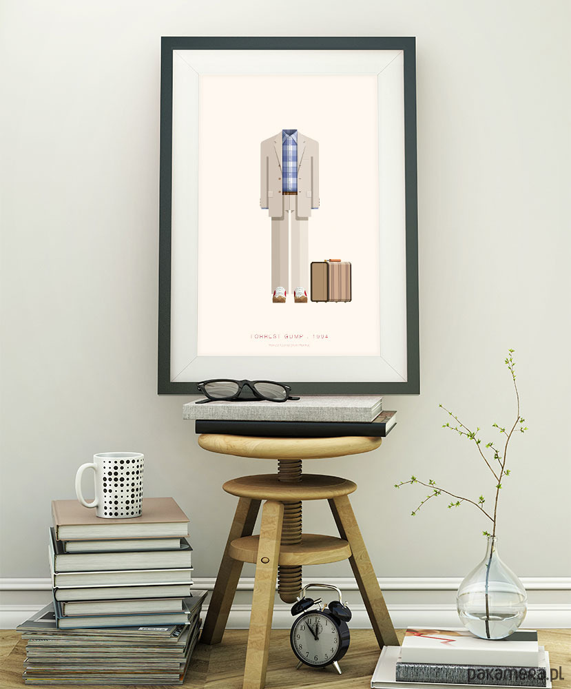Plakat inspirowany filmem Forrest Gump, reż. Robert Zemeckis. Przedstawia strój głównej postaci odtwarzanej przez Toma Hanksa, za którą to rolę w 1994 roku otrzymał Oscara. Stonowane kolory plakatu sprawdzą się w każdym wnętrzu. Każdy element kostiumu odtworzony został z geometryczną precyzją i nutą humoru - jak np. plamki błota na sportowych butach. Jak mawiał filmowy (i książkowy) bohater: "Życie jest jak pudełko czekoladek. Nigdy nie wiesz, co Ci się trafi".