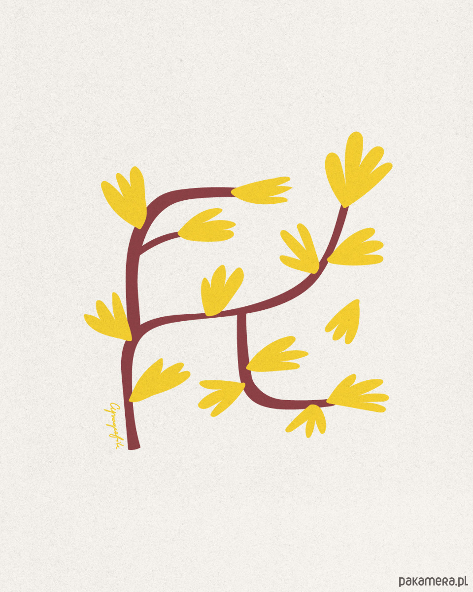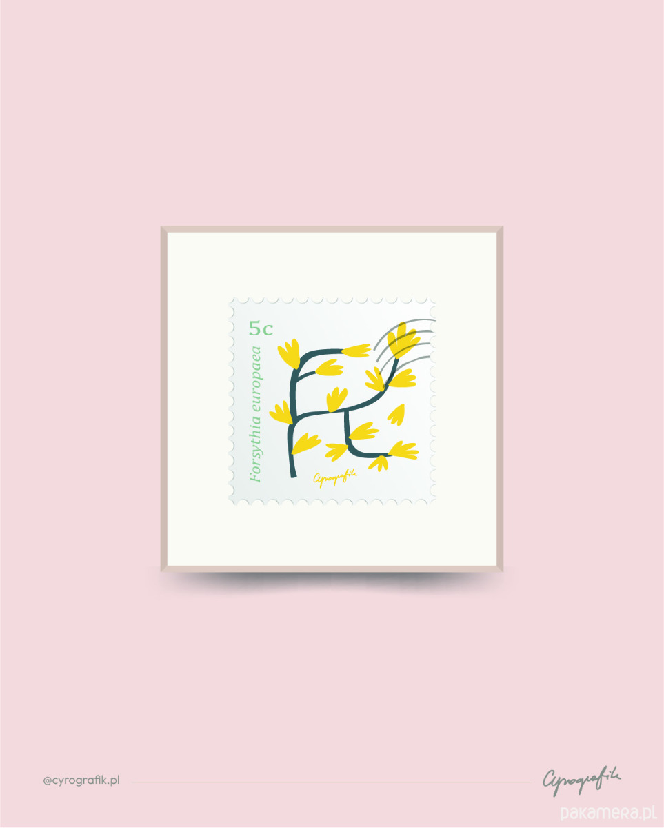 Minimalistyczny plakat inspirowany estetyką znaczków pocztowych, przedstawiający ilustrację Forsythia europaea (forsycja) w prostej i eleganckiej formie.