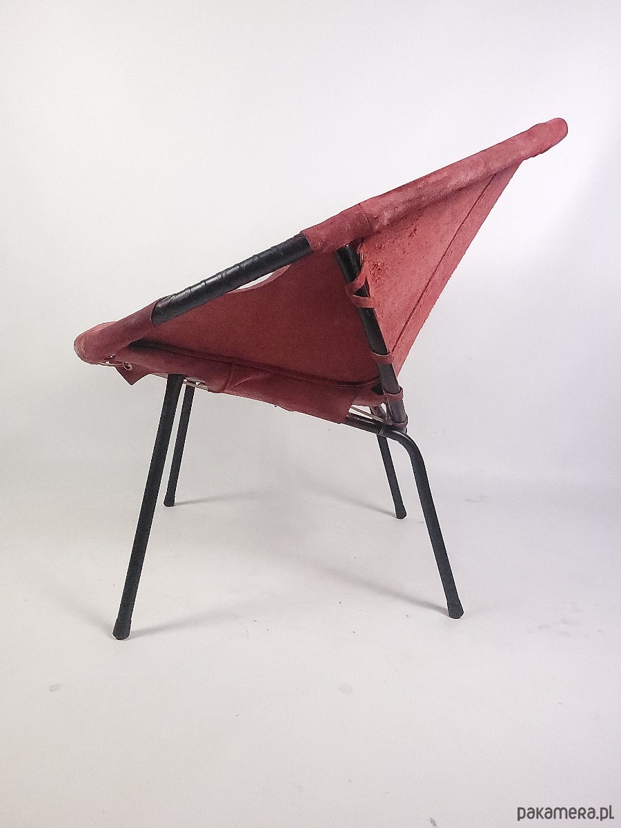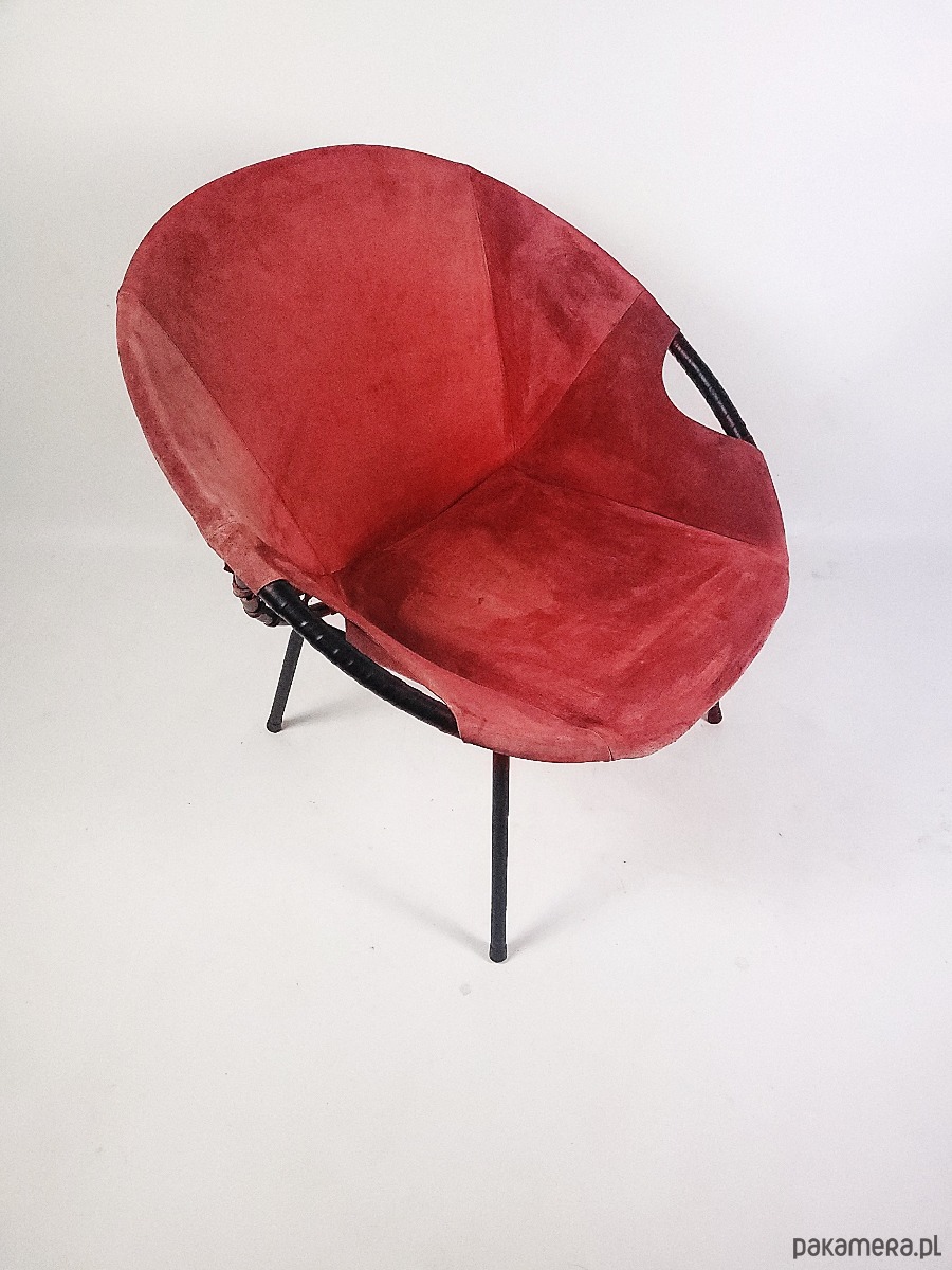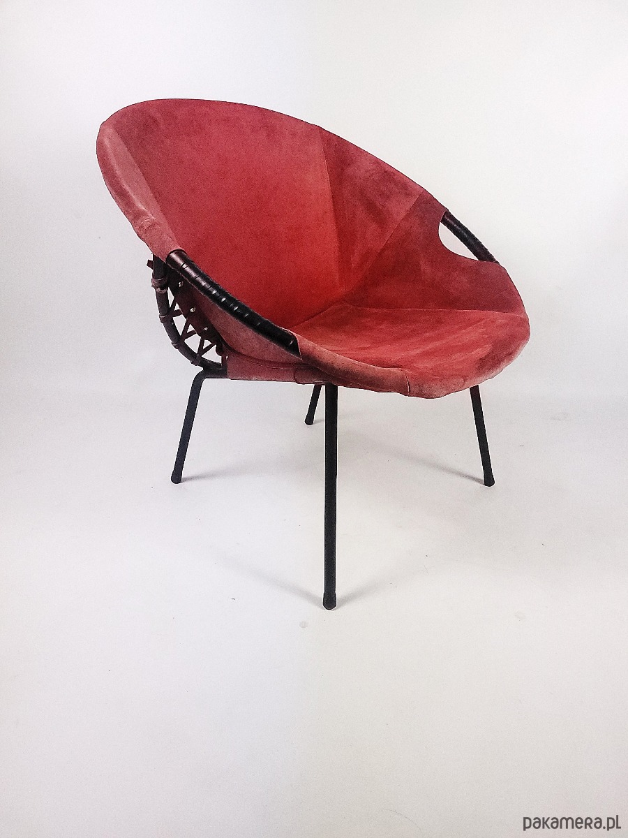 Oryginalny zamszowy fotel kubełkowy zaprojektowany Lusch & Co przez Lusch Erzeugnis. Skórzana tapicerka osadzona na lekkim, metalowym stelażu. Stan zachowania dobry, widoczne przetarcia oraz odbarwienia zamszu, fotel posiada niewielką dziurkę w oparciu.