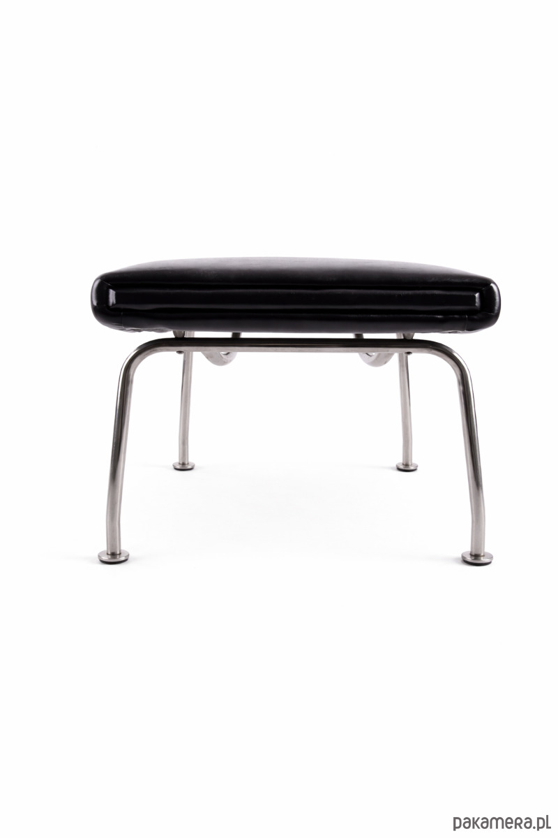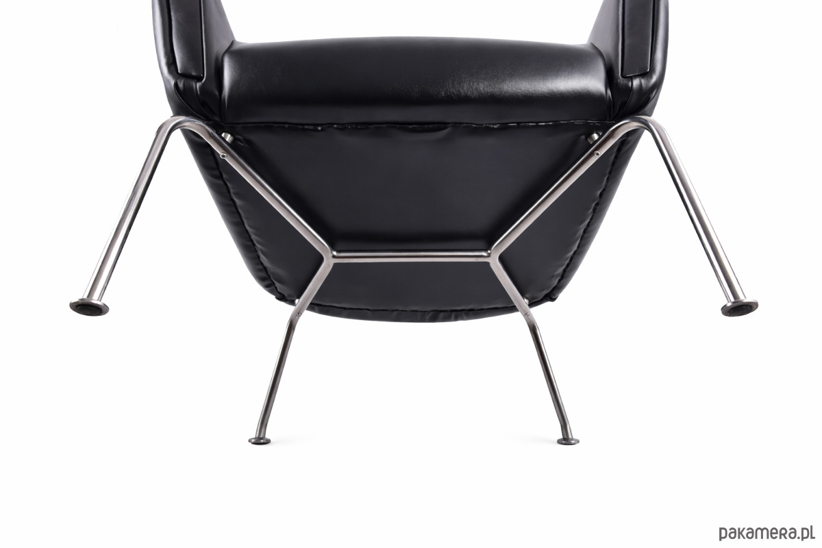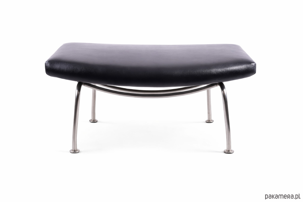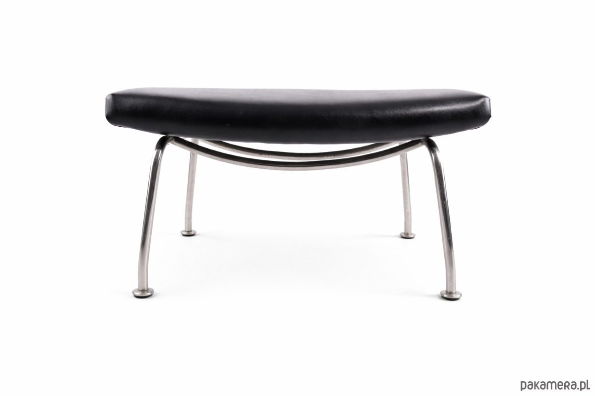 Oryginalna konstrukcja zachowana w całości: chromowany stelaż stalowy, charakterystyczne metalowe tulejki dystansowe przy łączeniach ramy oraz zgodne detale konstrukcyjne typowe dla produkcji Carl Hansen & Søn z lat 70. Fotel i podnóżek stanowią oryginalny, spójny komplet z tego samego okresu.