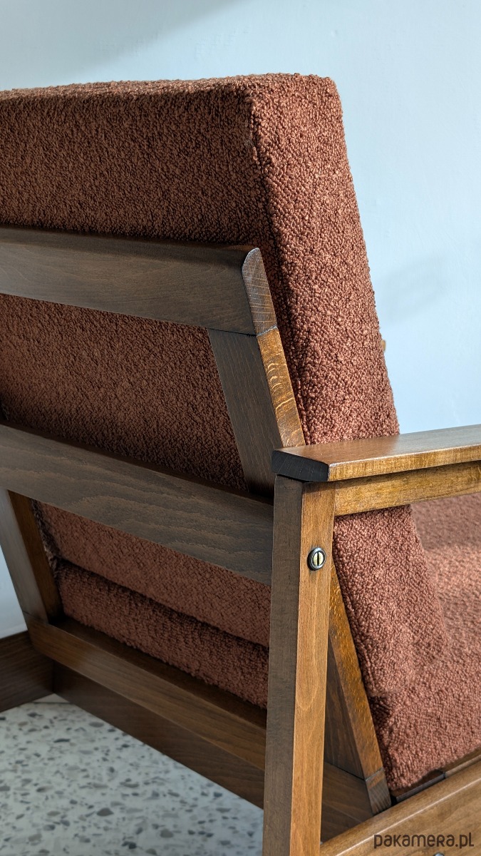 Elementy tapicerowane wykończone wysokiej jakości tkaniną boucle w intensywnym rudawym kolorze.