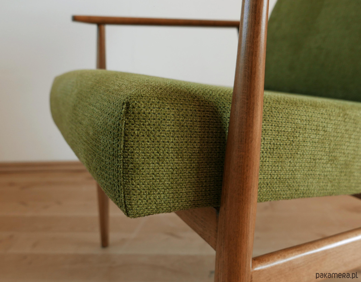 Fotele przeszły kompleksową renowację z dbałością o nawet najmniejszy szczegół. Stelaż został wyszlifowany ze wszystkich warstw farb oraz lakieru i ponownie pokryty farbą w kolorze dębowym o naturalnym wykończeniu oraz warstwą lakieru. Siedzisko rozebrane do gołego drewna i zbudowane od nowa, od pasów, przez nową piankę i owatę aż do nowej, pięknej tapicerki. Materiał obicia jets piękną tkaniną oliwkową ( bawełniano-poliestrowej ( 20% cotton 80% Poliester). Gotowy do użytku.
