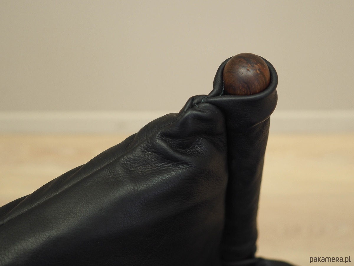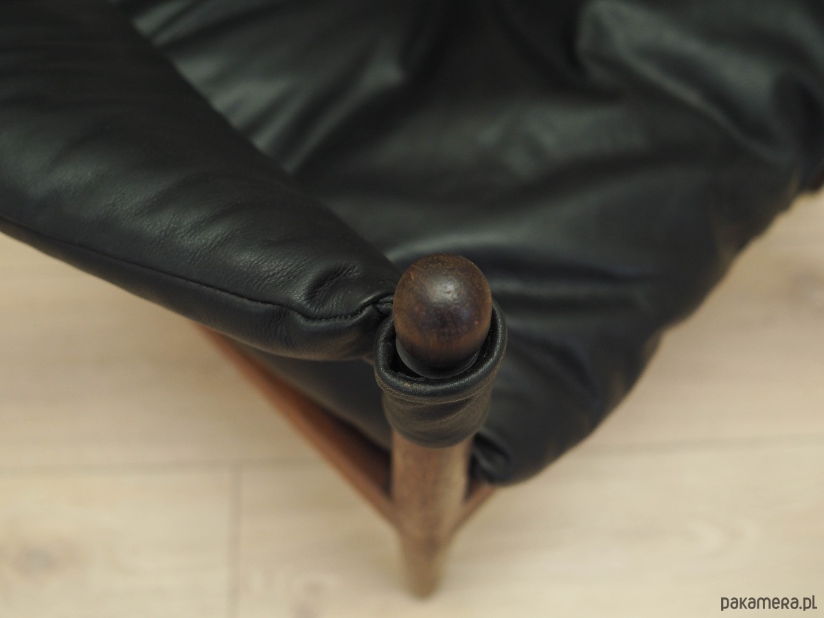 Konstrukcja wykonana jest z drewna palisandrowego. Drewno po odświeżeniu. Fotel pokryty jest oryginalną, wysokiej jakości skóra naturalną w kolorze czarnym.
