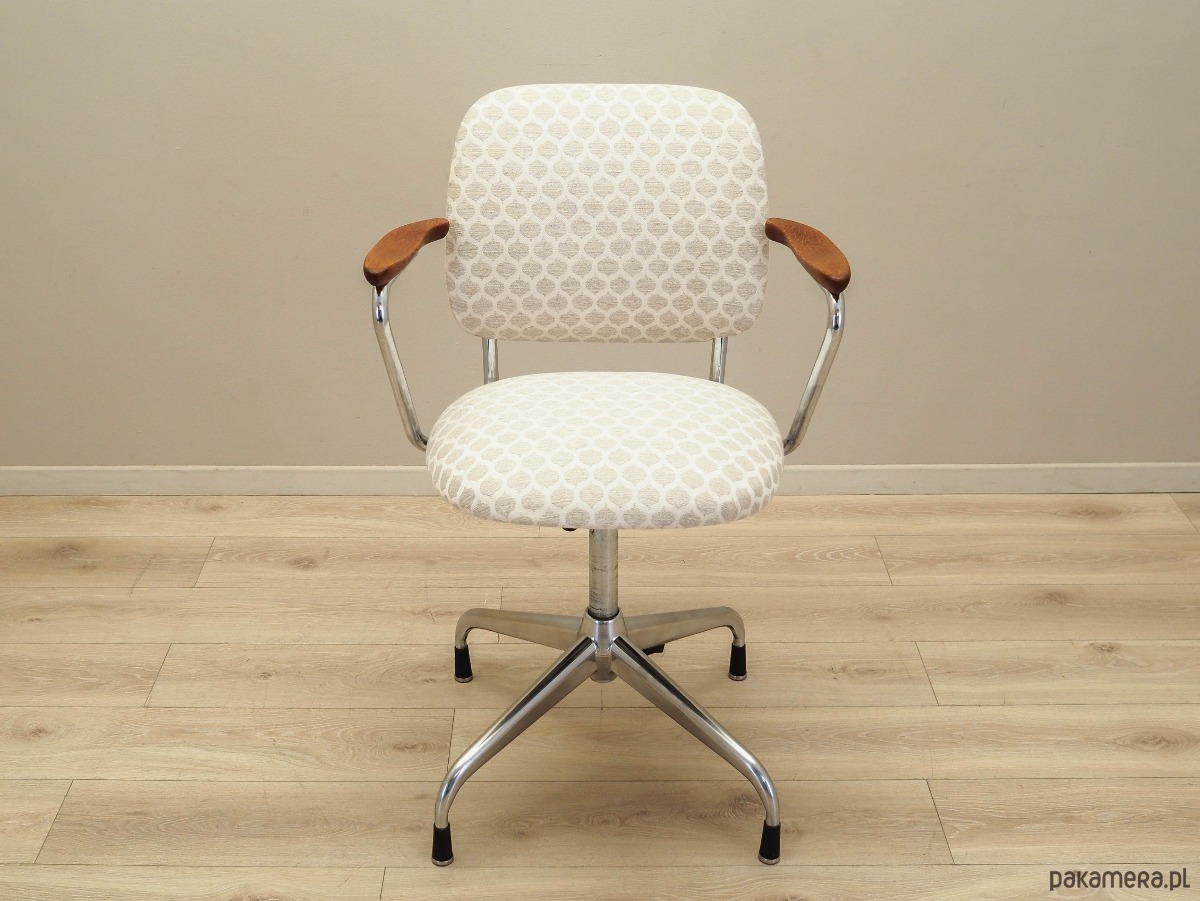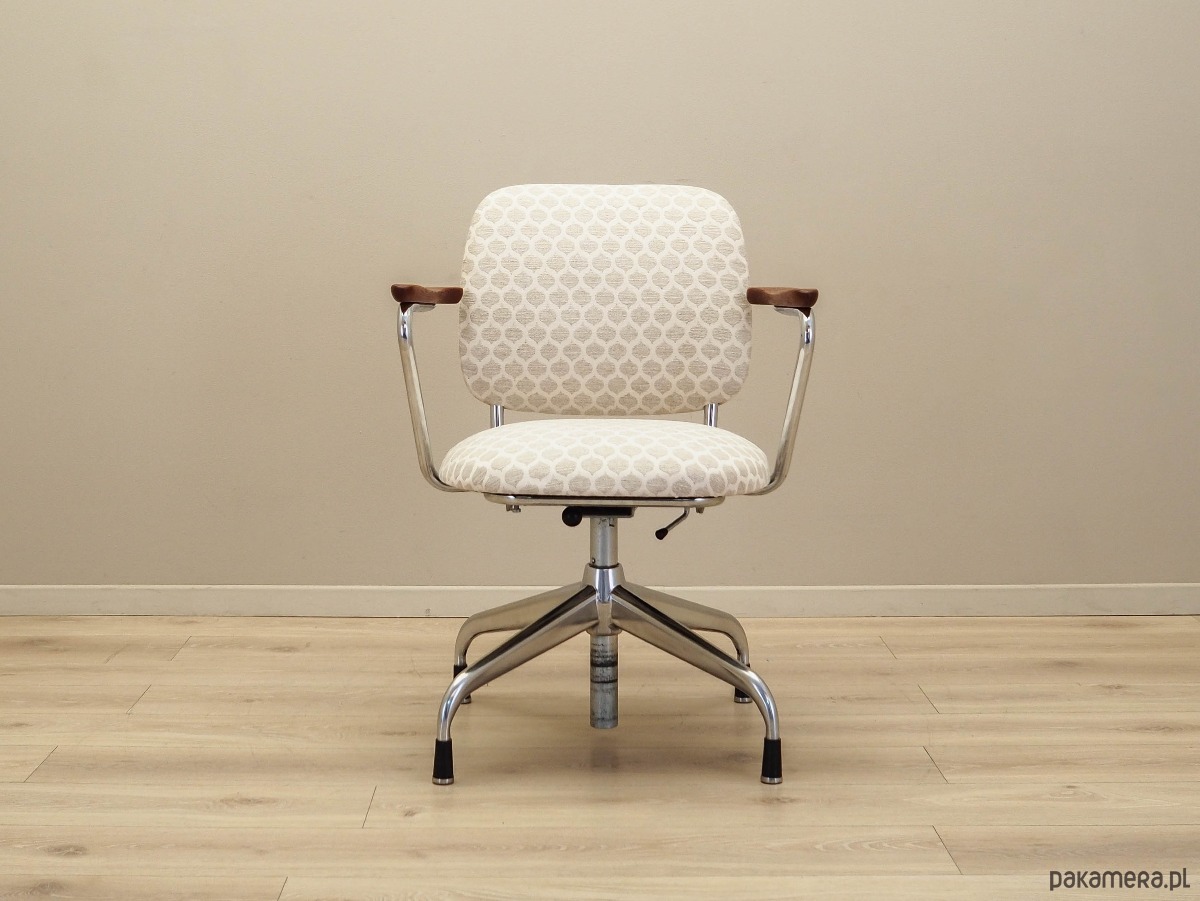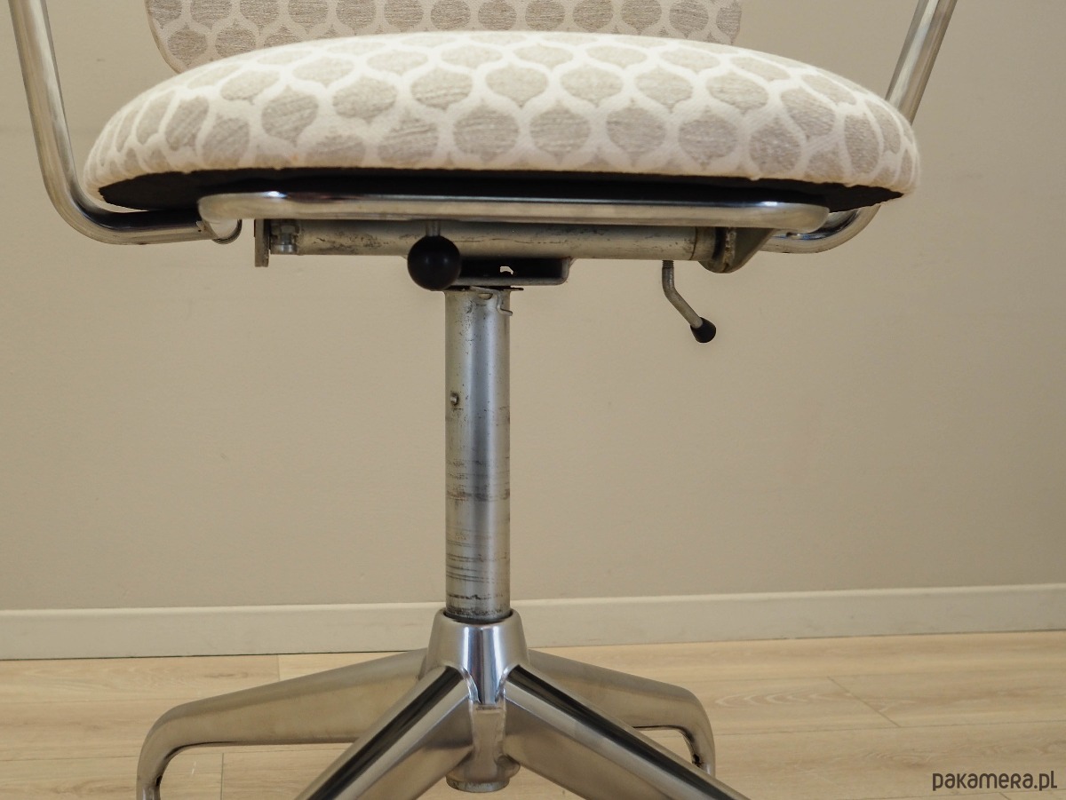 Podstawa oraz konstrukcja wykonane z metalu w kolorze srebrnym. Podłokietniki wykonane z litego drewna tekowego. Fotel został poddany renowacji tapicerskiej, tkanina wymieniona na nową. Tapicerka została wykonana w kolorach beżowym i białym, wykorzystana została wysokogatunkowa tkanina. Dodatkowym atutem jest możliwość regulacji wysokości oraz pochylenia.